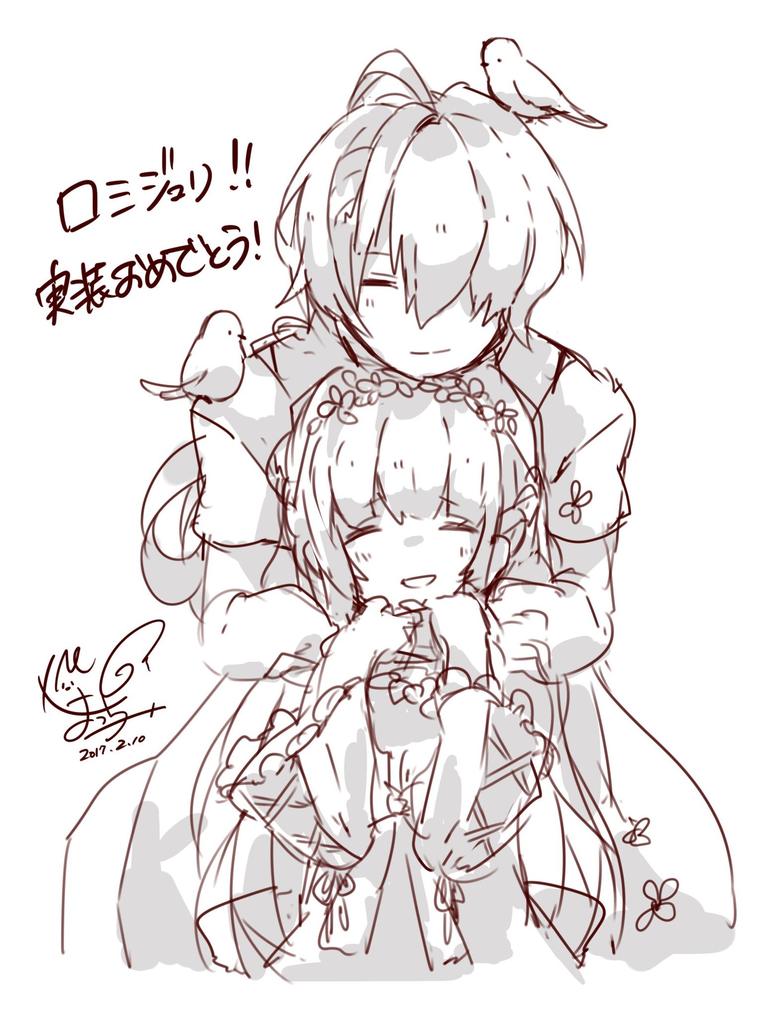 1boy 1girl ahoge animal animal_on_head animal_on_shoulder az_9649 bird bird_on_head bird_on_shoulder closed_mouth coat dated dress greyscale grimms_notes hair_over_one_eye hands_up highres juliet_(grimms_notes) juliet_(original)_(grimms_notes) long_hair monochrome on_head parted_lips romeo_(grimms_notes) romeo_(original)_(grimms_notes) signature simple_background smile translation_request white_background