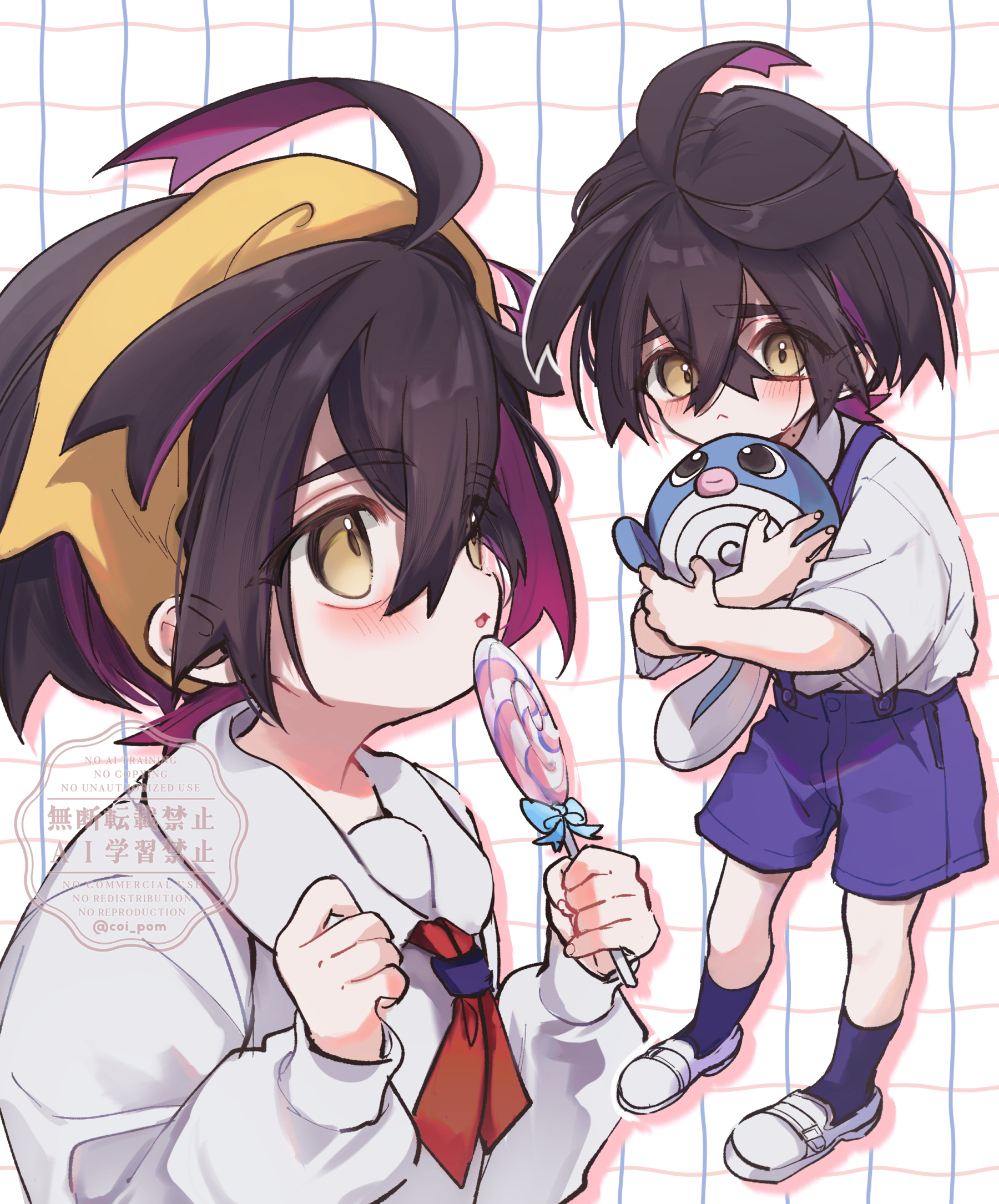 1boy :< aged_down black_hair blush candy child closed_mouth coi_pom commentary_request food gen_1_pokemon grid_background hair_between_eyes hairband highres holding holding_candy holding_food holding_lollipop holding_stuffed_toy kieran_(pokemon) lollipop long_sleeves male_focus mole mole_on_neck multicolored_hair multiple_views nintendo pokemon pokemon_scarlet_and_violet poliwag purple_hair shirt shoes short_sleeves shorts socks stuffed_animal stuffed_toy suspender_shorts suspenders white_shirt white_shoes yellow_eyes yellow_hairband