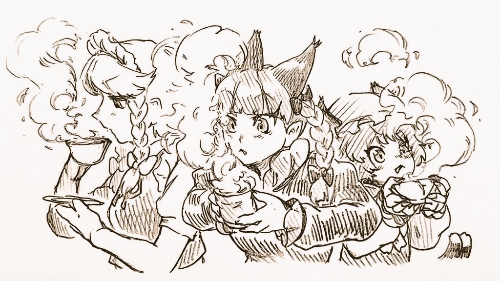 3girls animal_ears blowing bow braid cat_ears cat_tail chen commentary_request cup dress extra_ears hair_bow hat holding holding_cup holding_saucer izayoi_sakuya kaenbyou_rin long_hair maid maid_headdress menotama mob_cap multi-source_commentary multiple_girls multiple_tails nekomata open_mouth pointy_ears puffy_short_sleeves puffy_sleeves saucer short_sleeves steam tail teacup touhou traditional_media twin_braids two_tails yunomi