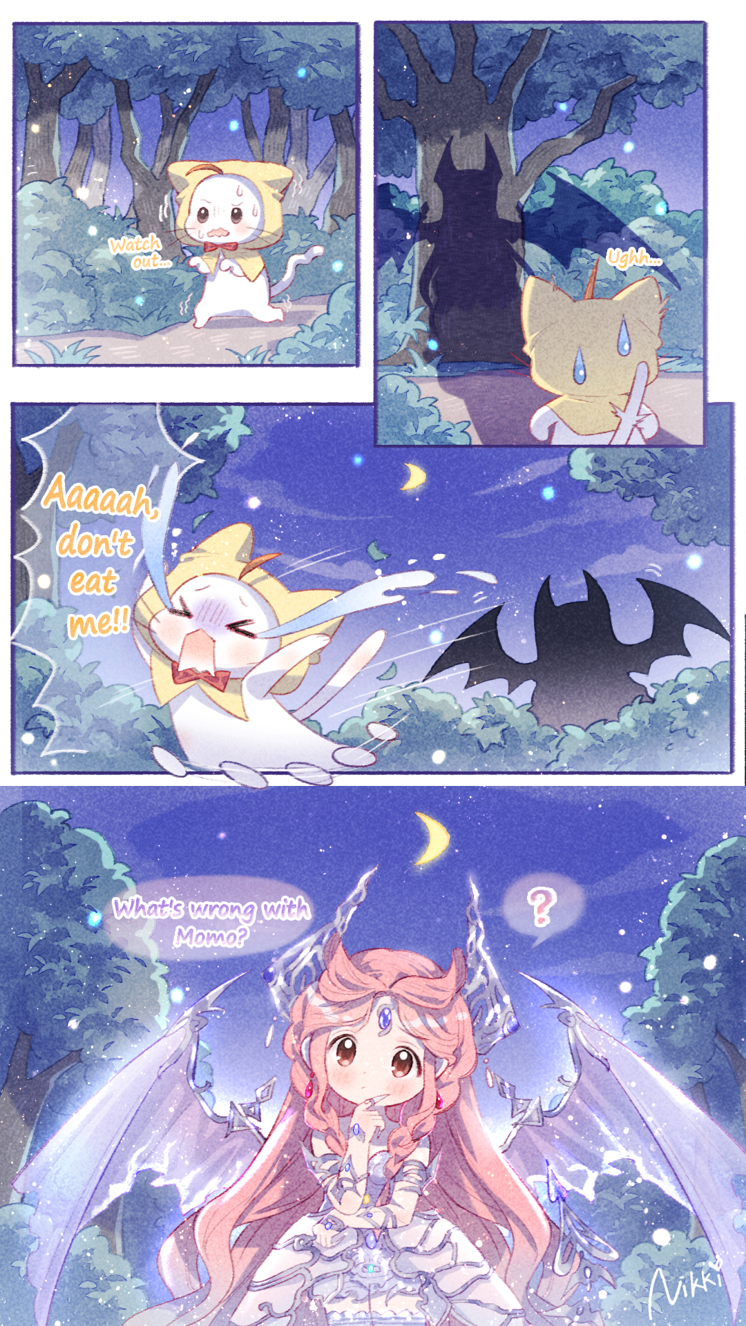 >_< :o ? ahoge animal armor artist_request bare_shoulders boots bow bowtie bracelet braid brown_eyes bush cat character_name cloak clothed_animal commentary confused crescent_moon crying dot_nose dragon_&_dream_of_gold_(shining_nikki) dragon_girl dragon_horns dragon_tail dragon_wings dress ear_covers ears_down english_commentary forehead_jewel forest frilled_boots frills frown gem hand_on_own_chin hand_on_own_elbow highres hood hood_up hooded_cloak horns jewelry light_blush light_particles long_hair miniskirt momo_(nikki) moon nature nervous_sweating night nikki_(nikki) nikki_(series) official_alternate_color official_art open_mouth outdoors parted_bangs parted_lips path pauldrons pendant_earrings pink_hair purple_boots purple_dress purple_gem purple_horns purple_wings red_bow red_bowtie road scared second-party_source shadow shining_nikki short_dress shoulder_armor showgirl_skirt side_braids skeletal_tail skirt sky spoken_question_mark star_(sky) starry_sky strapless strapless_dress streaming_tears sweat tail tareme tears thigh_boots traditional_bowtie turn_pale twin_braids very_long_hair wavy_hair wavy_mouth white_cat white_skirt wings yellow_cloak