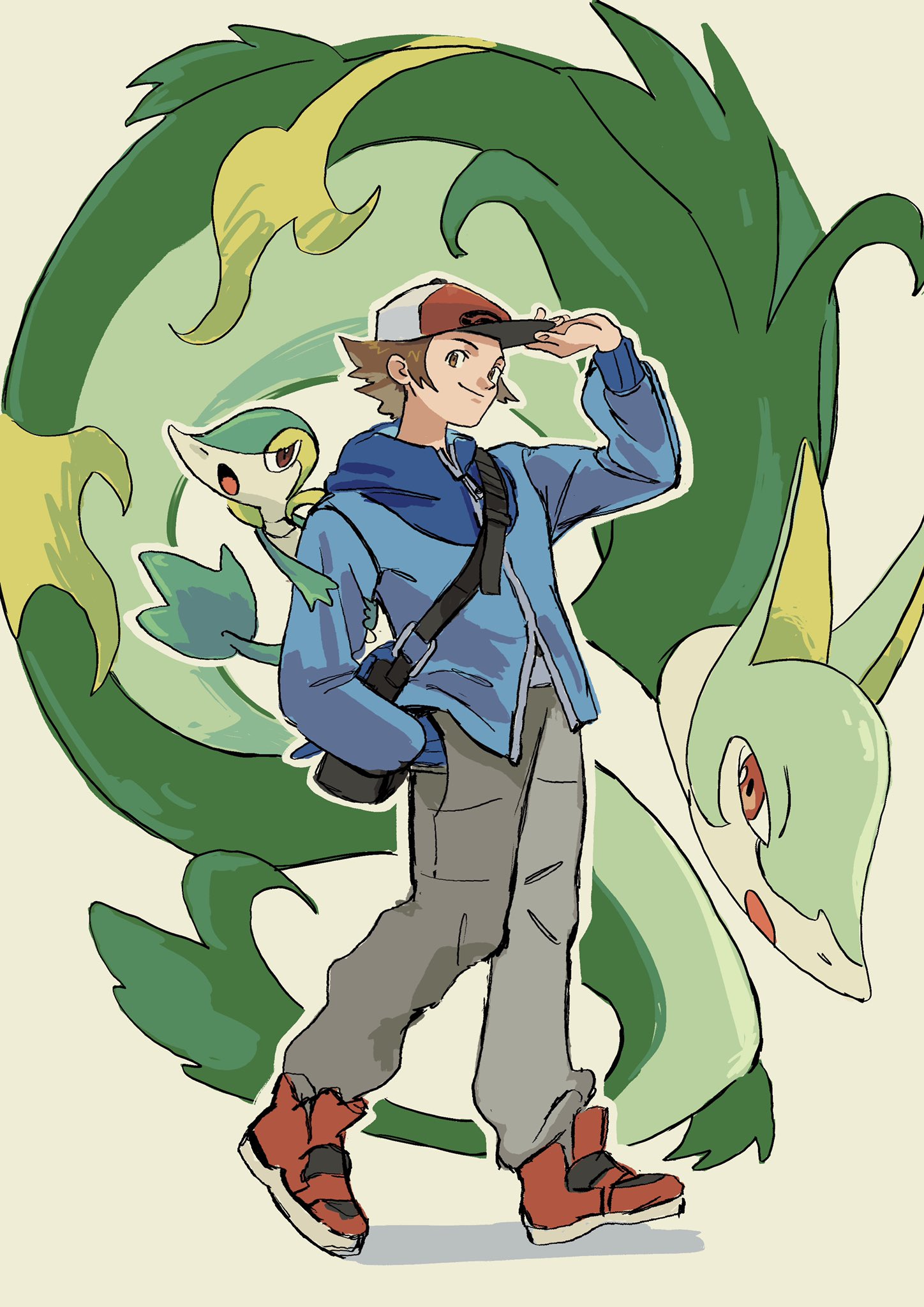 1boy bag baseball_cap black_bag blue_jacket brown_eyes brown_hair evolutionary_line gen_5_pokemon hat highres hilbert_(pokemon) jacket looking_at_viewer nintendo pokemon pokemon_(creature) pokemon_black_and_white red_shoes rikoicoico serperior servine shoes shoulder_bag simple_background sneakers snivy white_background