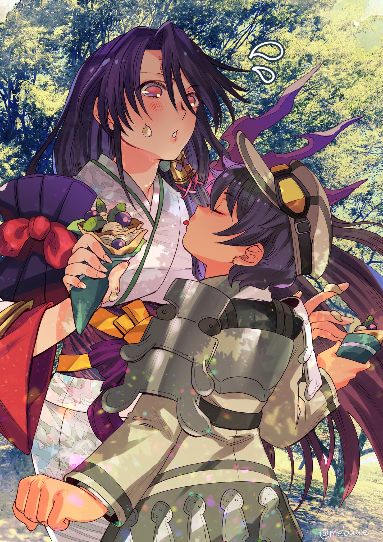 1boy 1girl black_hair brown_hat brown_shirt closed_eyes commentary_request cowboy_shot crepe el_mofus el_mofus_(black_hair_male) facial_mark flying_sweatdrops food food_on_face forehead_mark goggles goggles_on_headwear hat hayasaka_mebawe height_difference highres holding holding_crepe holding_food japanese_clothes kimono long_hair looking_at_another newsboy_cap nikkou_(rance_series) obi outdoors parted_lips photo_background pink_eyes purple_sash rance_(series) rance_x sash shirt short_hair standing tall_female tongue tongue_out tree very_long_hair white_kimono