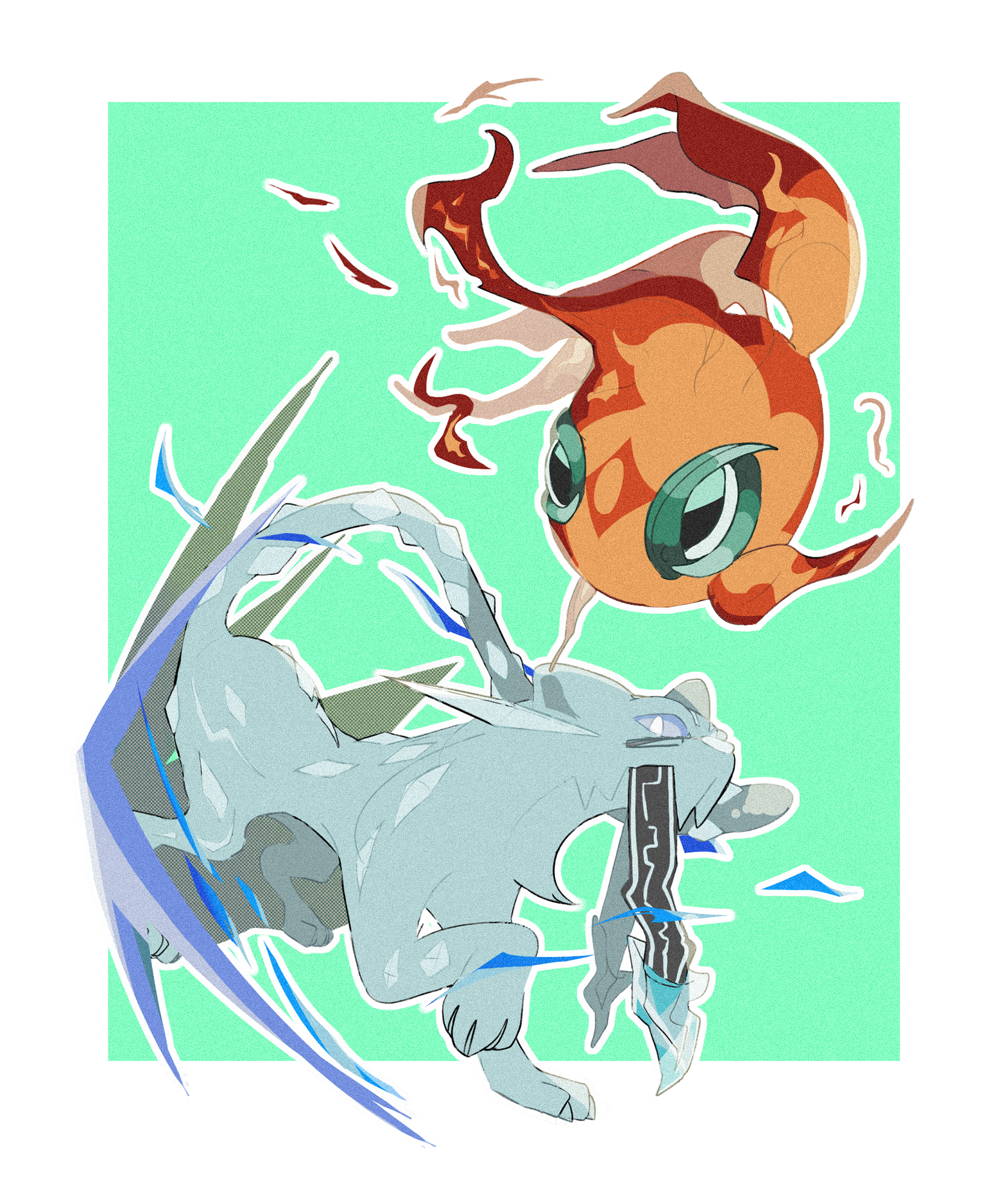 animal_focus aqua_background border chi-yu_(pokemon) chien-pao commentary_request fire full_body highres minami_(fsubqki_gh0st) nintendo no_humans outline pokemon pokemon_(creature) pokemon_focus simple_background white_border white_outline