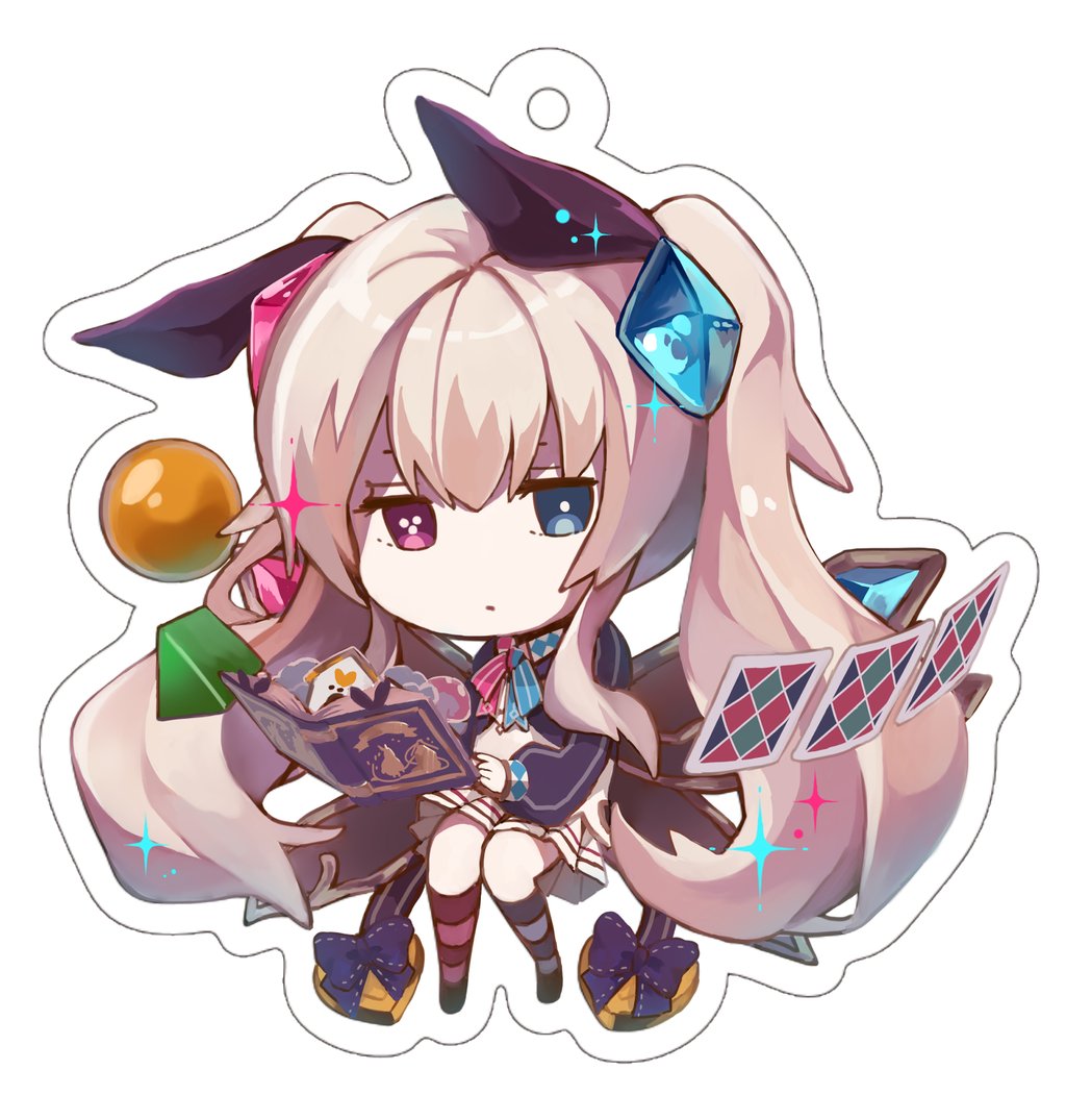 1girl alice_undertale_(grimms_notes) asymmetrical_legwear az_9649 blonde_hair blue_eyes book chaos_alice_(grimms_notes) chaos_alice_(original)_(grimms_notes) character_charm charm_(object) chibi chibi_only closed_mouth full_body grimms_notes hair_between_eyes hair_ornament heterochromia long_hair long_sleeves looking_at_viewer mismatched_legwear mismatched_pupils open_book puffy_long_sleeves puffy_sleeves red_eyes simple_background skirt solo sparkle twintails very_long_hair white_background white_skirt