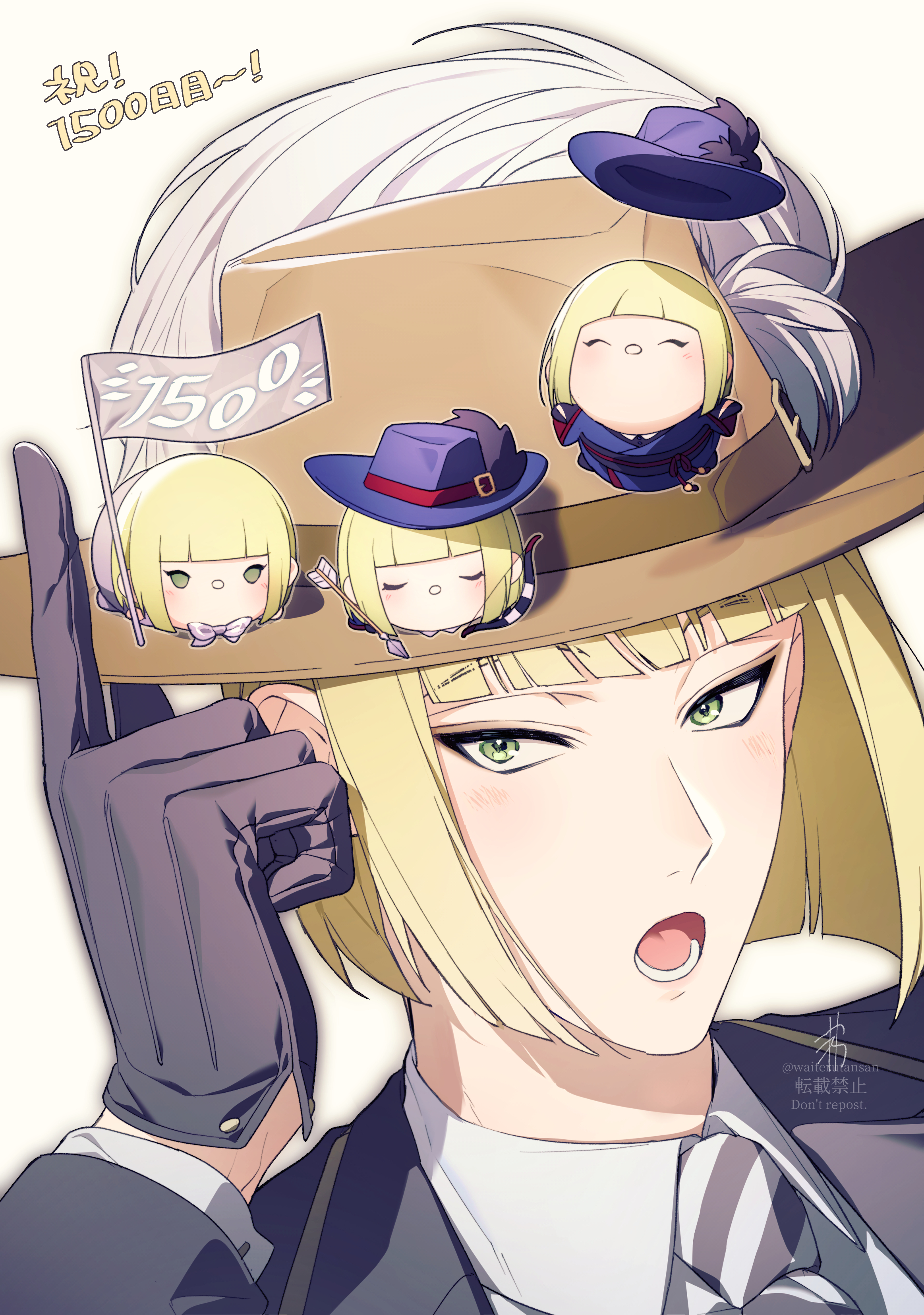 1boy 3others absurdres black_gloves black_jacket blonde_hair blunt_bangs blush bob_cut bow_(weapon) collarbone collared_shirt commentary_request gloves green_eyes hat_feather highres jacket l_hand long_sleeves looking_to_the_side multiple_others night_raven_college_school_uniform open_mouth pomefiore_dorm_uniform rook_hunt school_uniform shirt short_hair signature simple_background tsum-tsum twisted_wonderland twitter_username waiterutansan weapon white_background