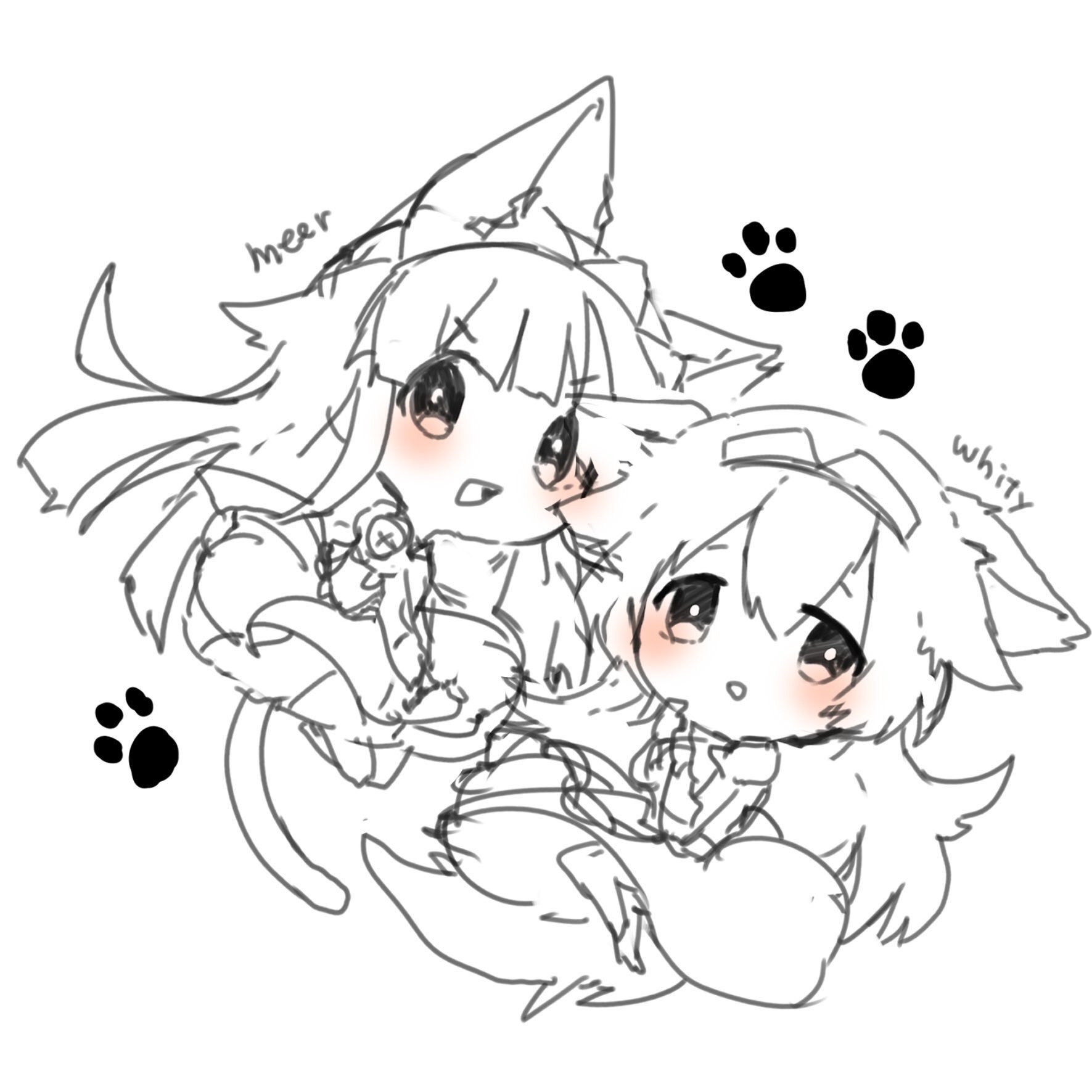 2girls animal_ears az_9649 blunt_bangs blush cat_ears cat_girl cat_tail character_name chibi chibi_only dress full_body grimms_notes hair_between_eyes headdress highres long_hair looking_at_viewer multiple_girls mya_(grimms_notes) parted_lips paw_print sidelocks sketch smile spot_color tail teeth typo upper_teeth_only v-shaped_eyebrows whitey_(grimms_notes)