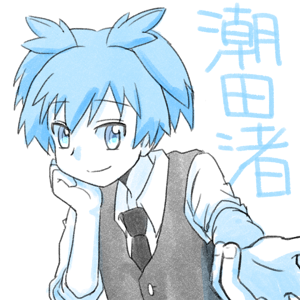 1boy ansatsu_kyoushitsu ao_anpk aqua_eyes aqua_hair black_necktie closed_mouth collared_shirt commentary_request grey_vest hand_on_own_face head_rest male_focus necktie reaching reaching_towards_viewer shiota_nagisa shirt short_hair simple_background smile translation_request two_side_up upper_body vest white_background white_shirt