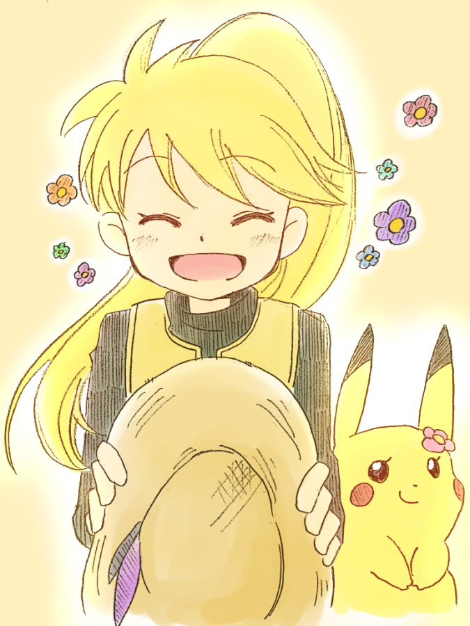 ao_anpk blonde_hair blush chuchu_(pokemon) closed_eyes closed_mouth commentary_request eyelashes flower gen_1_pokemon hat holding holding_unworn_clothes holding_unworn_hat long_hair long_sleeves nintendo open_mouth pikachu pokemon pokemon_adventures ponytail simple_background smile straw_hat unworn_hat unworn_headwear yellow_(pokemon) yellow_background