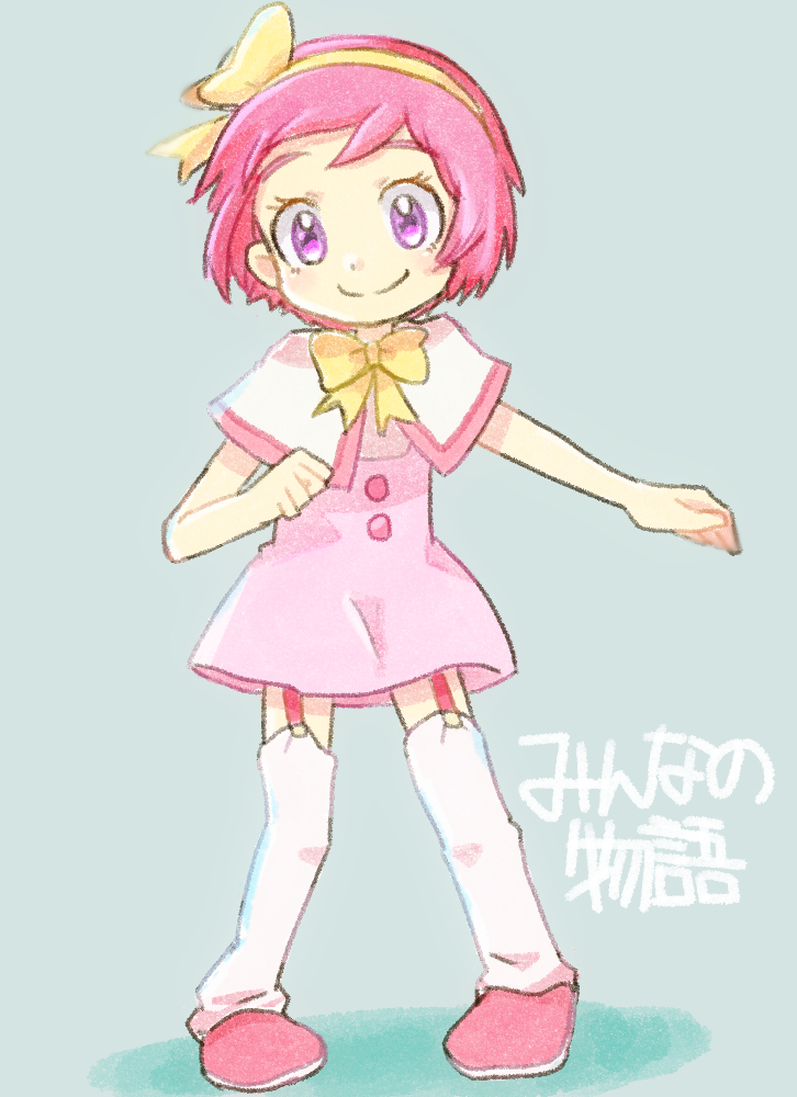 1girl ao_anpk blue_background bow capelet child commentary_request dress eyelashes full_body hairband margo_(pokemon) nintendo open_mouth pink_dress pink_hair pink_shoes pokemon pokemon_(anime) pokemon_the_movie:_the_power_of_us purple_eyes shoes short_hair simple_background smile socks solo standing translation_request white_capelet white_socks yellow_bow yellow_hairband