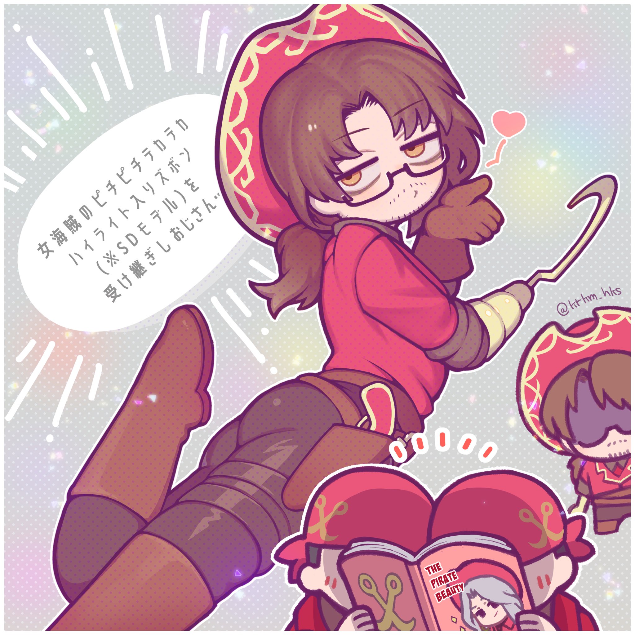 3boys absurdres alternate_costume artist_name ass bandana beard_stubble belt belt_buckle black-framed_eyewear black-framed_glasses black_belt black_hair black_pants black_strap blowing_kiss blush book boot_straps boots brown_belt brown_boots brown_gloves brown_hair buckle chibi closed_mouth collared_jacket contrast_collar dutch_angle elbow_gloves faceless faceless_male facial_hair formal_clothes glasses gloves gold_trim gold_weapon golden_gun gregor_(project_moon) grey_background gun gun_holster half-closed_eyes halftone halftone_background hat heart highres holding holding_book holding_manga holster hook hook_hand jacket jitome kiss knee_boots krkm_hks lapels leather leather_pants leg_up limbus_company long_hair long_sleeves looking_at_another looking_at_viewer looking_back low_ponytail lying male_focus manga_(object) multiple_boys notched_lapels notice_lines official_alternate_costume on_stomach opaque_glasses open_book outline pants parted_bangs pirate_costume pirate_hat ponytail project_moon reading red_bandana red_hat red_jacket red_shirt semi-rimless_eyewear shaded_face shirt simple_background single_glove sleeves_rolled_up solo_focus sparkle sparkle_background speech_bubble standing strap stubble thigh_strap twinhook_pirates_(identity)_(project_moon) twitter_username under-rim_eyewear weapon white_outline yellow_eyes