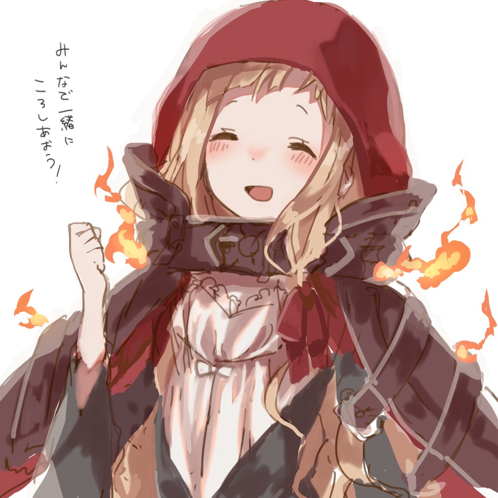 1girl az_9649 black_jacket blonde_hair bow clenched_hand closed_eyes fire forehead hood hood_up jacket light_blush long_hair red_hood red_riding_hood_(sinoalice) simple_background sinoalice smile solo upper_body white_background white_bow