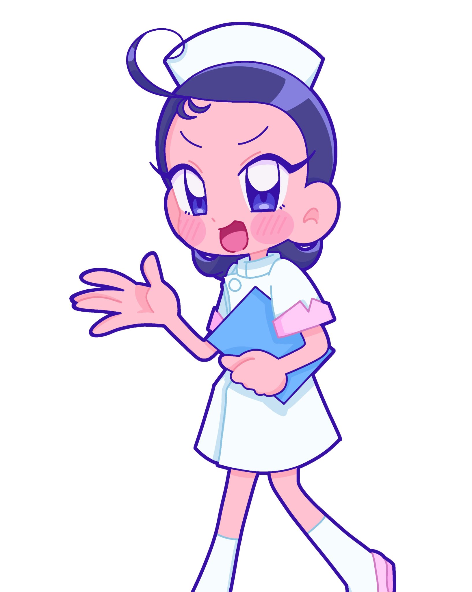 1girl :d ahoge alternate_costume blue_eyes blue_hair blush_stickers clipboard commentary dress feet_out_of_frame hand_up hat high_collar highres holding holding_clipboard looking_at_viewer mary_janes medium_hair nurse nurse_cap ojamajo_doremi open_mouth pamerukurarukuu pink_shoes senoo_aiko shoes short_sleeves simple_background smile socks solo untranslatable_commentary v-shaped_eyebrows walking white_background white_dress white_hat white_socks
