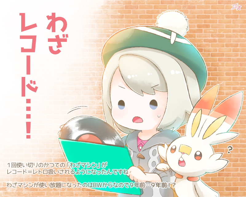 1girl ? brick_wall commentary_request gen_8_pokemon gloria_(pokemon) green_hat grey_hair grey_jacket hat holding hood hood_down hooded_jacket jacket long_sleeves nintendo official_alternate_hair_color open_mouth pokemon pokemon_(creature) pokemon_sword_and_shield samsung_(yuzuikka) scorbunny short_hair sweatdrop tam_o'_shanter tr_(pokemon) translation_request vinyl_record