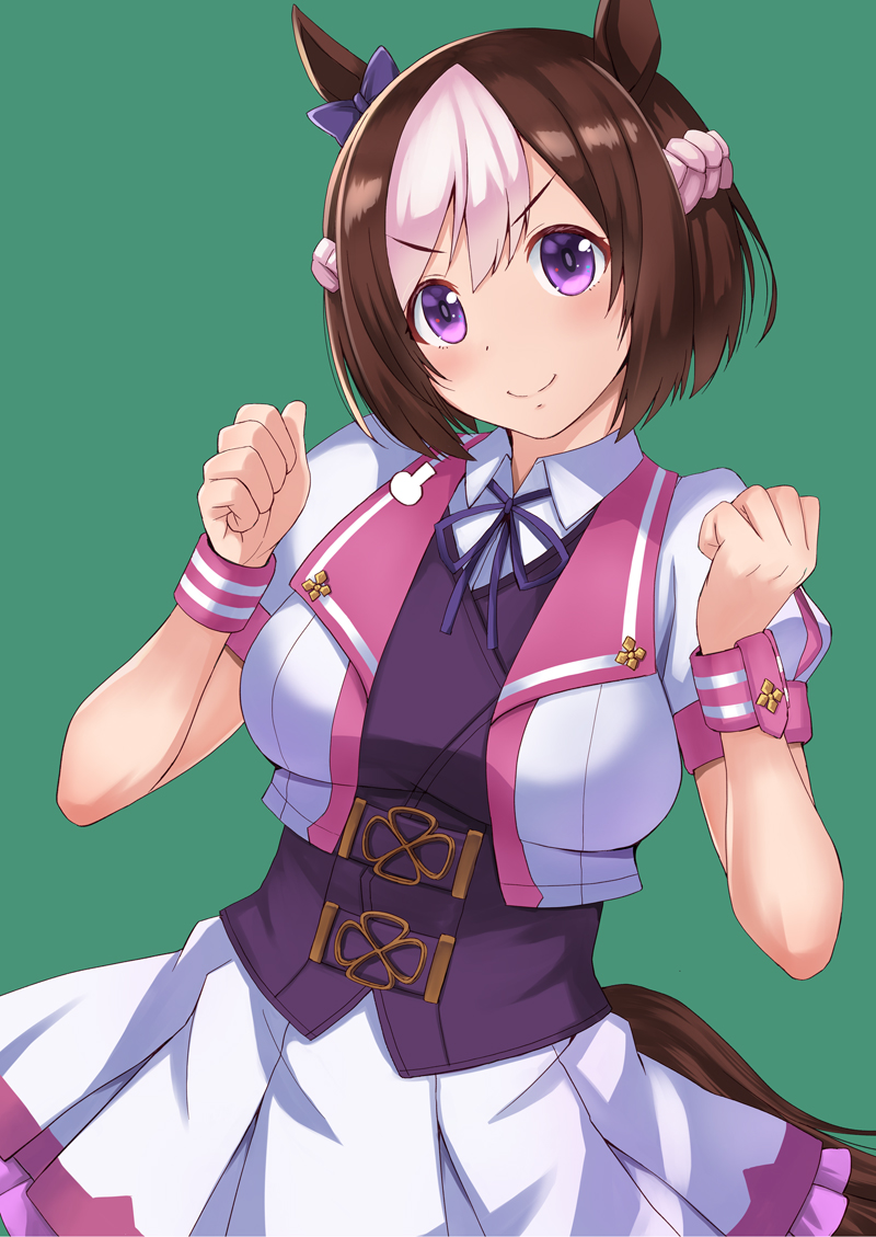 1girl animal_ears blush bow braid breasts brown_hair clenched_hands closed_mouth collared_shirt commentary_request cropped_jacket ear_bow green_background half_up_braid horse_ears horse_girl horse_tail jacket kokuriu looking_at_viewer medium_breasts multicolored_hair purple_bow purple_eyes purple_ribbon purple_vest ribbon shirt short_hair short_sleeves simple_background skirt smile special_week_(special_dreamer)_(umamusume) special_week_(umamusume) tail two-tone_hair umamusume vest white_hair white_jacket white_shirt white_skirt wristband