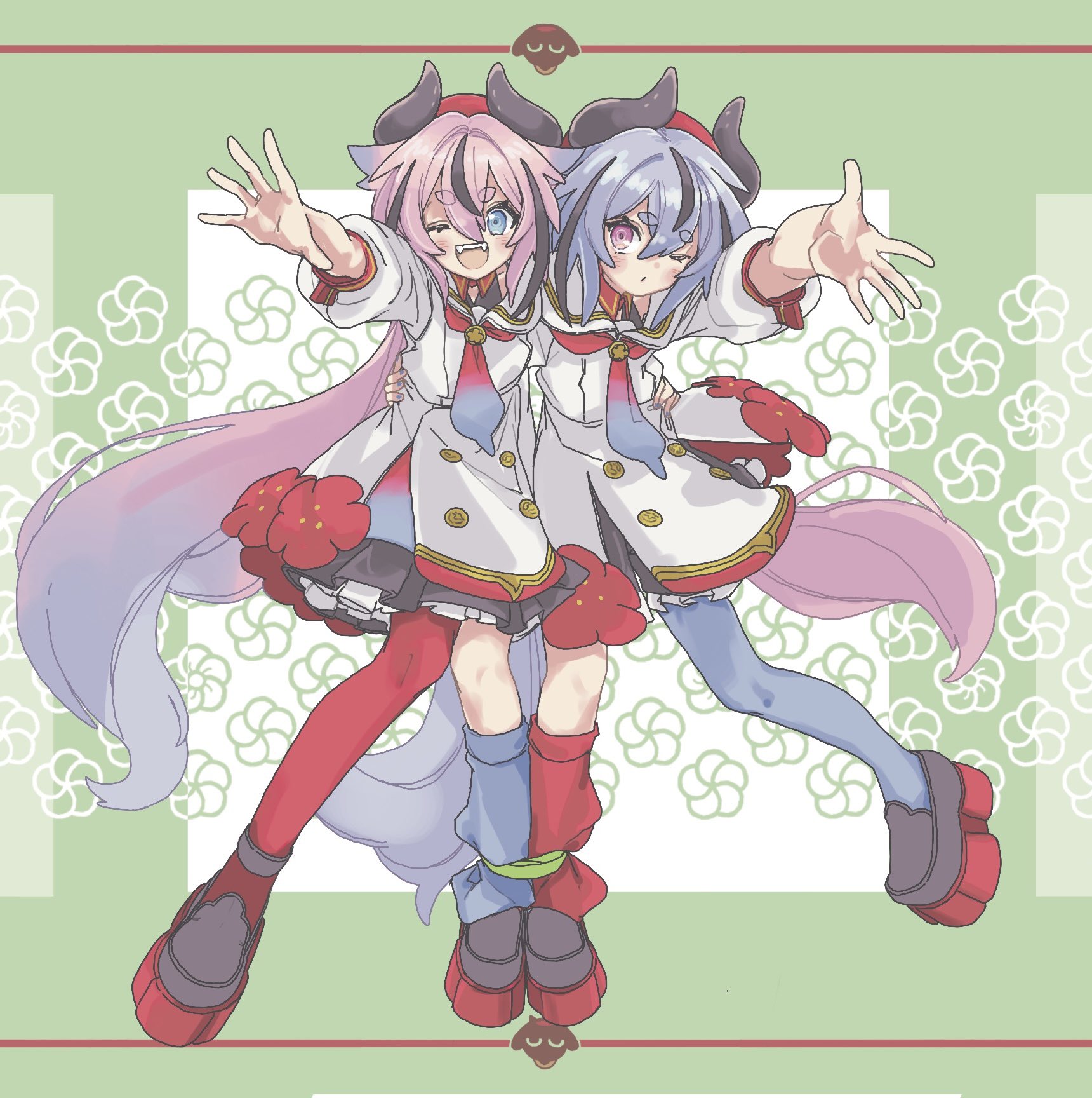 2others :d a.i._voice absurdly_long_hair asymmetrical_legwear beret black_dress black_horns black_shirt black_shoes black_streaks blue_eyes blue_hair blue_leg_warmers blue_necktie blue_pantyhose buttons commentary cropped doku_yakedo double-breasted double-parted_bangs dress fangs flower frilled_dress frilled_shorts frills full_body gradient_hair green_background gynoid_talk hair_flaps hair_intakes hat highres horned_hat horns layered_dress leg_warmers long_hair low_twintails meika_hime meika_hime_(a.i._voice_2) meika_mikoto meika_mikoto_(a.i._voice_2) mismatched_legwear multicolored_hair multicolored_necktie multiple_others multiple_persona necktie off-shoulder_dress off_shoulder one_eye_closed open_mouth outstretched_arm pantyhose pink_eyes pink_hair platform_shoes plum_blossoms puffy_sleeves red_hat red_leg_warmers red_necktie red_pantyhose sailor_collar shirt shirt_under_dress shoes shorts single_leg_warmer smile streaked_hair teeth thick_eyebrows three-legged_race three-quarter_sleeves twintails upper_teeth_only very_long_hair vocaloid white_dress