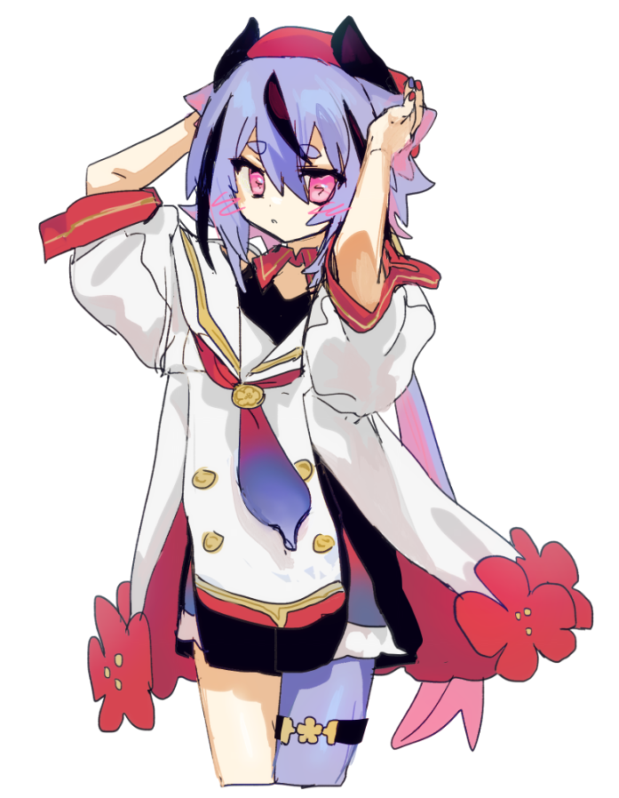 1other a.i._voice bare_shoulders belt beret black_horns black_shorts black_streaks blue_hair blue_nails blue_necktie blue_pantyhose buttons collar commentary contrast_collar cropped_legs double-breasted dress flower frilled_shorts frills gradient_hair gradient_necktie hair_between_eyes hat horned_hat horns long_hair low_ponytail meika_mikoto meika_mikoto_(a.i._voice_2) multicolored_hair multicolored_nails multicolored_necktie nail_polish necktie off-shoulder_dress off_shoulder pantyhose parted_lips pink_eyes pink_hair plum_blossoms ponytail puffy_sleeves red_collar red_hat red_nails red_necktie sailor_collar sanotsuki_(mochi0101_831) short_eyebrows shorts shorts_under_dress simple_background single_leg_pantyhose solo streaked_hair thick_eyebrows thigh_belt thigh_strap three-quarter_sleeves two-sided_dress two-sided_fabric very_long_hair white_background white_dress white_sailor_collar