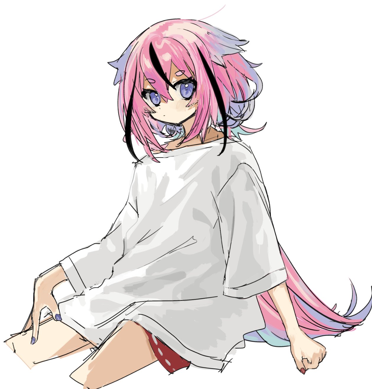 1other a.i._voice asymmetrical_nails black_streaks blue_eyes blue_hair blue_nails closed_mouth commentary cropped_legs double-parted_bangs gynoid_talk highres long_hair looking_at_viewer loungewear meika_hime multicolored_hair nail_polish oversized_clothes oversized_shirt pink_hair red_nails red_skirt ribbon-trimmed_skirt ribbon_trim sanotsuki_(mochi0101_831) shirt short_eyebrows sidelocks simple_background skirt solo streaked_hair thick_eyebrows very_long_hair vocaloid white_background white_shirt