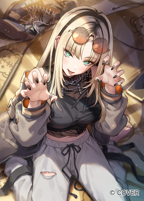 1girl barefoot black_hair black_nails black_tank_top blonde_hair blunt_ends boots breasts chain chain_necklace claw_pose commentary_request company_name copyright_notice crop_top cropped_shirt curtained_hair drawstring ear_piercing eyewear_on_head fingernails from_above green_eyes grey_pants halter_shirt halterneck hands_up hololive hololive_dev_is jacket jewelry koganei_niko koganei_niko_(1st_costume) large_breasts long_hair long_sleeves looking_at_viewer multicolored_hair nail_polish navel necklace official_art open_clothes open_jacket orange-tinted_eyewear pants pbj_(gelgelpbj) piercing ring round_eyewear shirt sitting sleeveless sleeveless_shirt smile solo sukajan sweatpants tank_top tinted_eyewear tongue tongue_out torn_clothes torn_pants two-tone_hair unworn_boots virtual_youtuber wariza