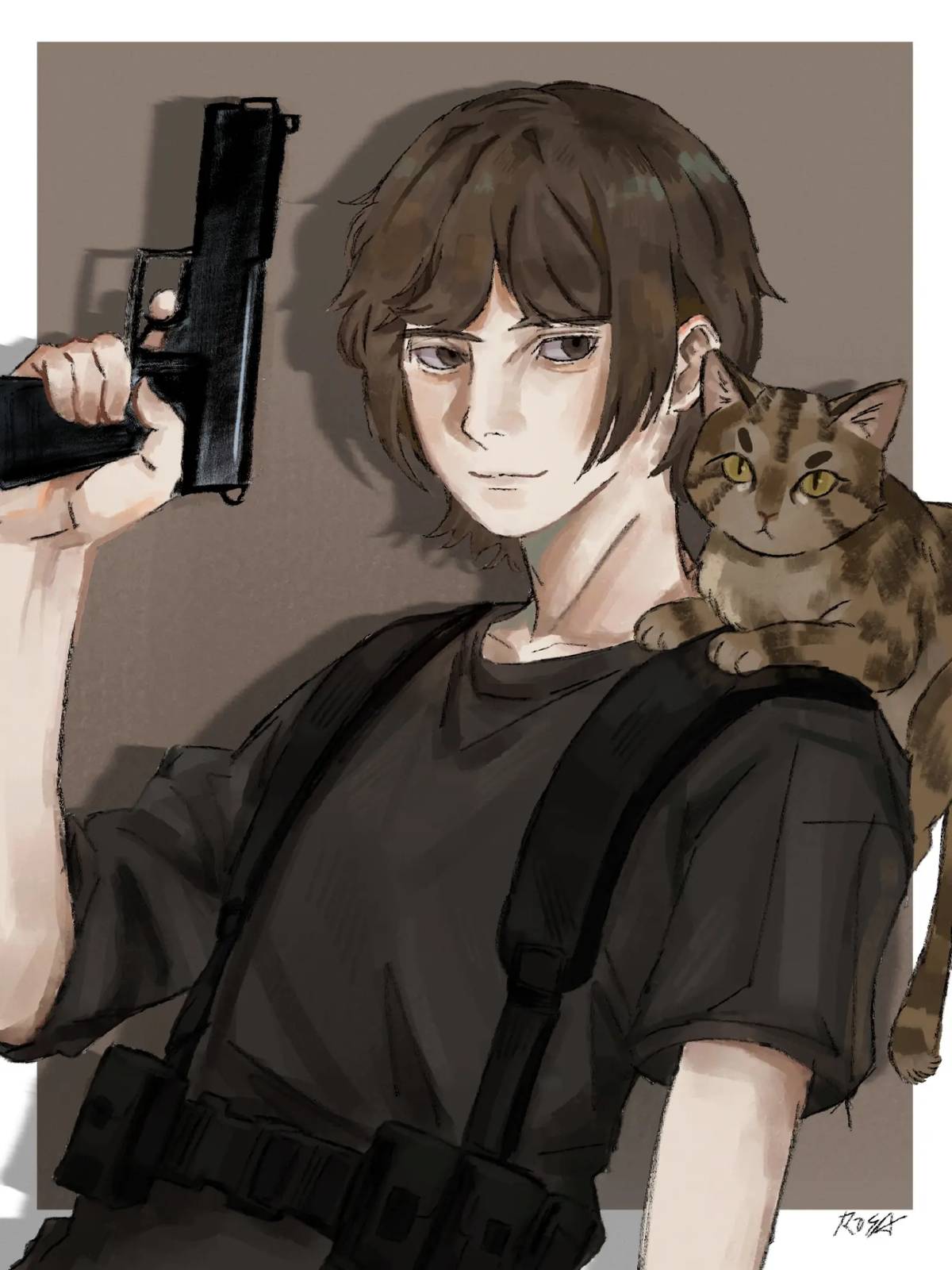 1boy animal animal_on_shoulder arm_at_side arthur_achleitner artist_name asymmetrical_sleeves bare_arms black_shirt border brown_background brown_cat brown_eyes brown_hair cat cat_on_shoulder closed_mouth collarbone commentary drop_shadow english_commentary finger_on_trigger from_side gun hand_up handgun highres holding holding_gun holding_weapon liesel_rosa looking_at_viewer male_focus outside_border photo-referenced real_life shirt short_hair short_sleeves simple_background smile solo three-quarter_sleeves true_crime uneven_sleeves upper_body weapon white_border