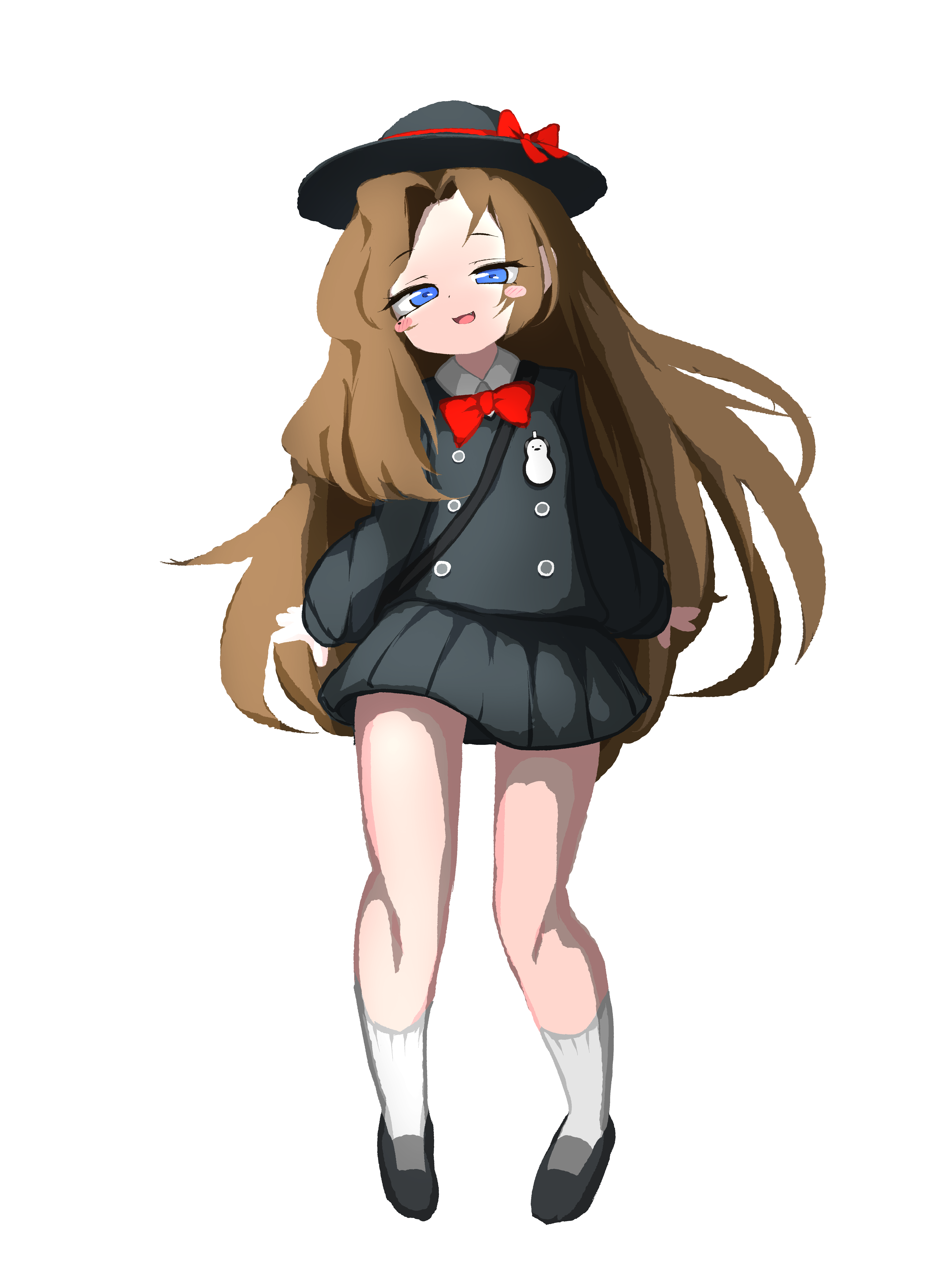 1girl 54772 absurdres aged_down bird black_skirt blue_eyes bow brown_hair child commentary_request hat highres kindergarten_uniform korean_commentary limbus_company limbus_kindergarten_uniform official_alternate_costume penguin pleated_skirt project_moon red_bow rodion_(project_moon) school_hat simple_background skirt socks solo white_background white_socks