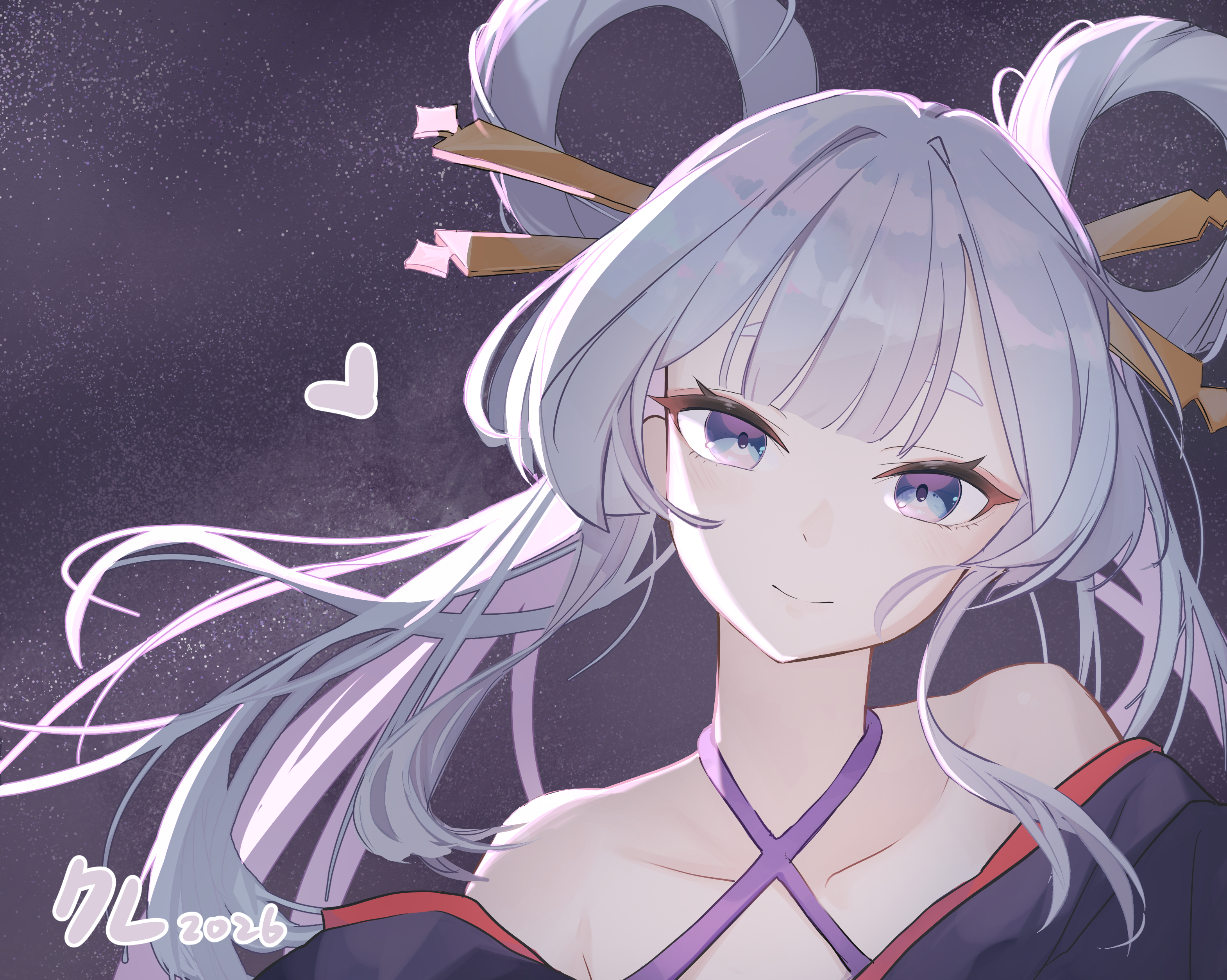 1girl absurdres blue_eyes blush cho_kaguya-hime! closed_mouth collarbone colored_inner_hair commentary hair_ornament hair_rings hair_stick heart highres kure_(kuremnn) long_hair looking_at_viewer multicolored_hair off_shoulder pink_background pink_hair runami_yachiyo smile solo star_(sky) starry_sky_background upper_body white_hair