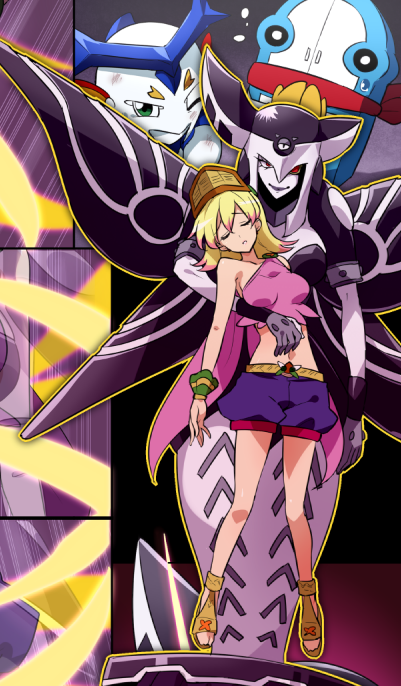 1girl bare_shoulders beetma blonde_hair bouken_yuuki_pluster_world breasts commentary_request delie green_eyes heropin large_breasts looking_at_viewer midriff mochimako_(mushikera_hoi2) monster_girl multicolored_hair multiple_girls navel open_mouth sandals short_hair shorts tank_top two-tone_hair yuri