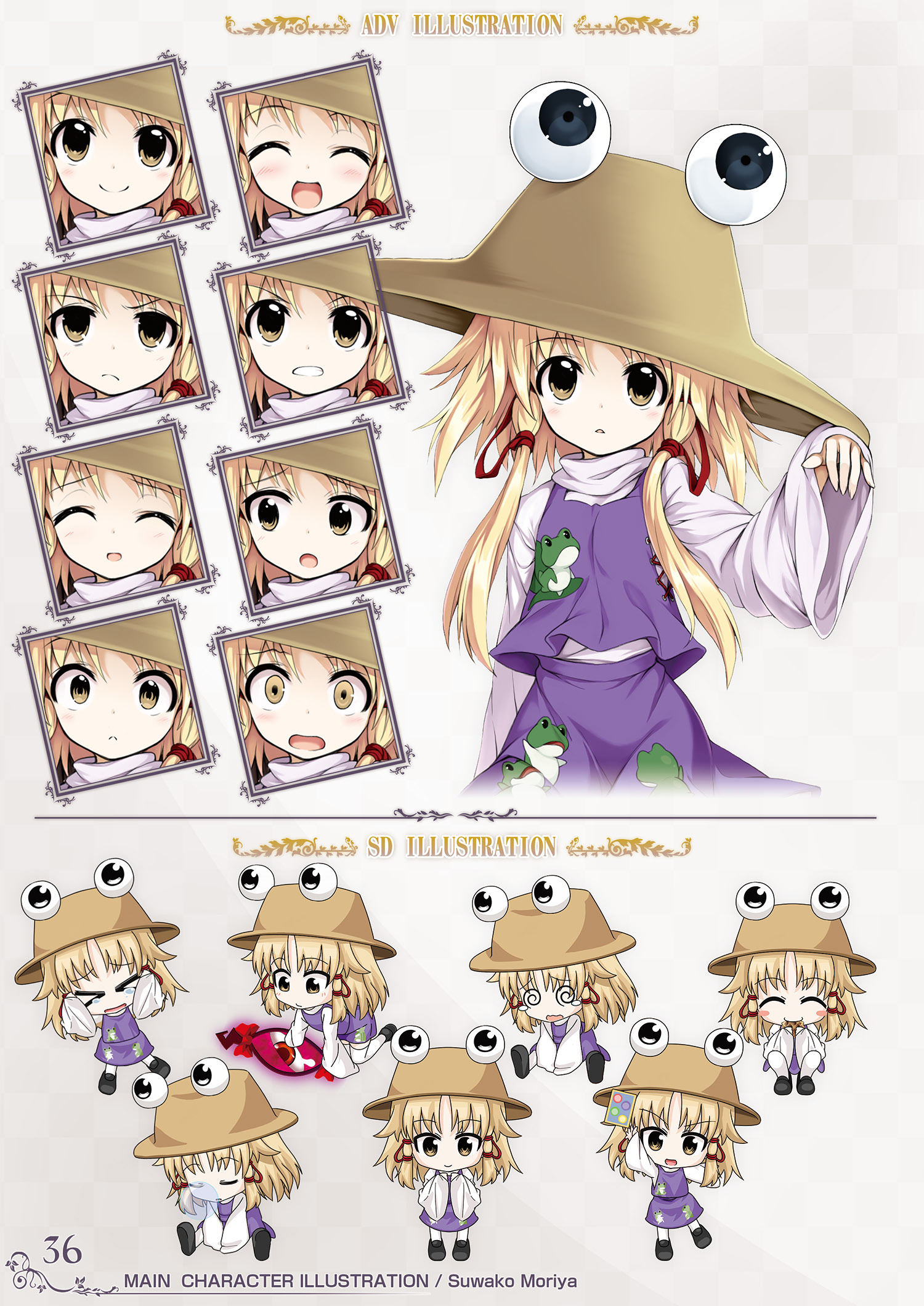 >_< 1girl @_@ angry animal_print aqua-lia artbook bad_id blonde_hair blush brown_hat bucket_hat character_name chibi closed_eyes closed_mouth cropped_torso crying english_text expressionless eye_on_hat frog_print frown full_body furrowed_brow fushigi_no_gensokyo gap_(touhou) grey_background grimace hand_up hat highres looking_ahead looking_at_viewer moriya_suwako multiple_expressions multiple_views nose_bubble official_art open_mouth page_number parted_lips portrait purple_skirt purple_vest shirt short_hair_with_long_locks sitting skirt sleeping smile solo spell_card sprite_sheet standing touhou v-shaped_eyebrows vest white_shirt wide_sleeves yellow_eyes