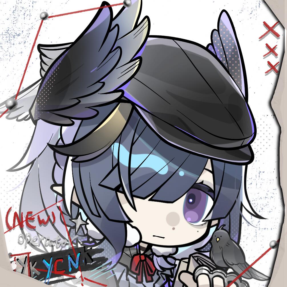 1girl arknights bad_source bird black_hair blue_hair character_name chibi closed_mouth commentary_request crow earrings gloves hair_over_one_eye hat jacket jewelry looking_at_viewer mole mole_under_eye multicolored_hair neck_ribbon newsboy_cap pointy_ears purple_eyes purple_hair red_ribbon ribbon shirt solo streaked_hair ukusik_(arknights) upper_body white_background yi_niao