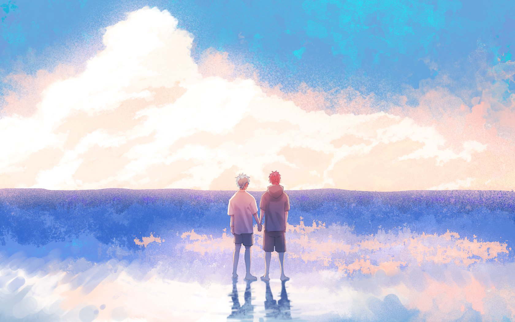 2boys akashi_seijuurou cloud commentary_request facing_away from_behind full_body gensyuuu highres holding_hands hood hood_down kuroko_no_basuke kuroko_tetsuya male_focus multiple_boys reflective_floor short_hair short_sleeves shorts standing yaoi