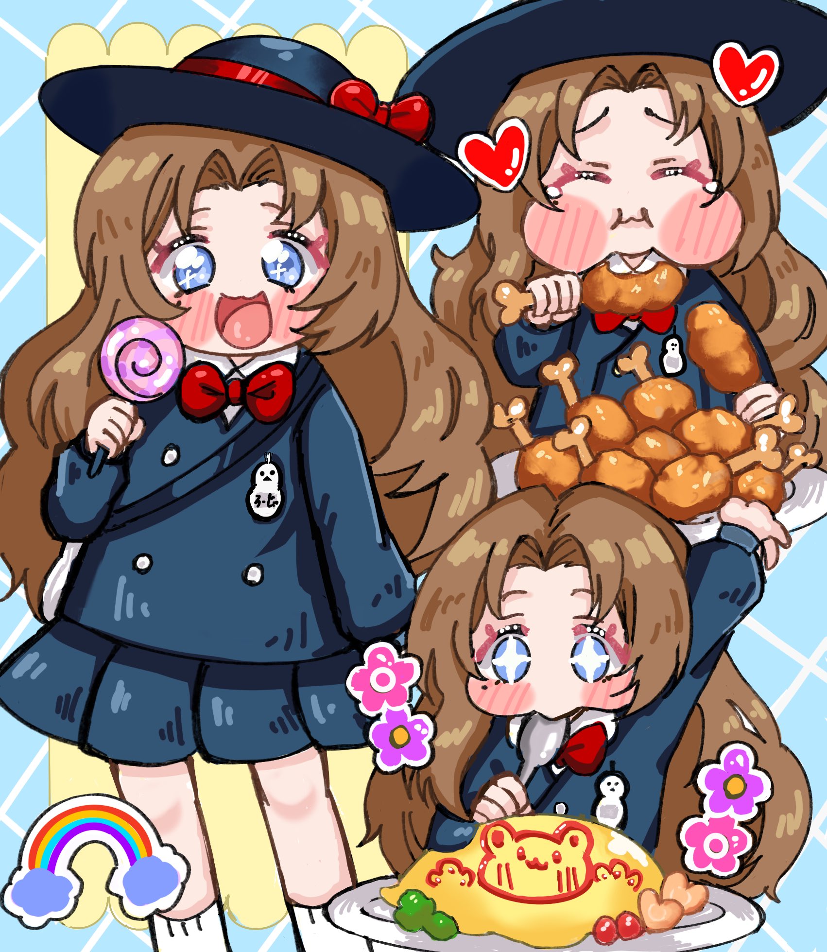 +_+ 1girl aged_down black_skirt blue_eyes bow brown_hair candy chicken_(food) child closed_eyes closed_mouth commentary_request eating flower flower_sticker food heart highres holding holding_candy holding_food holding_lollipop holding_spoon kindergarten_uniform limbus_company limbus_kindergarten_uniform lollipop long_hair official_alternate_costume omelet omurice open_mouth pleated_skirt project_moon rainbow_sticker red_bow rodion_(project_moon) sai48053309 skirt socks solo sparkling_eyes spoon swirl_lollipop white_socks