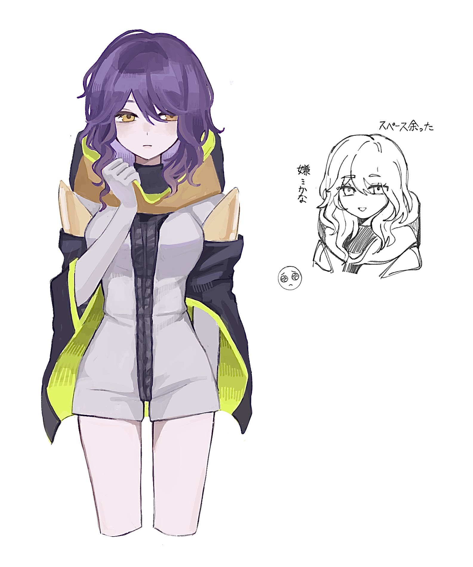 1girl closed_mouth commentary_request gina_(gnosia) gloves gnosia hair_between_eyes heterochromia highres hjm_gn hood hoodie long_sleeves looking_at_viewer medium_hair purple_hair simple_background solo upper_body wavy_hair