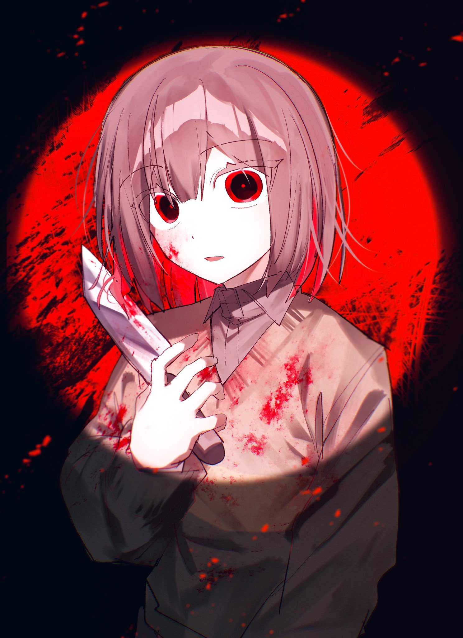 1other arm_at_side black_eyes blood blood_on_cheek blood_on_clothes blood_on_face bloody_knife blurry bob_cut bright_pupils brown_hair brown_shirt brown_sweater center-flap_bangs chara_(undertale) chromatic_aberration collared_shirt colored_eyelashes colored_inner_hair commentary_request depth_of_field double-parted_bangs eyes_visible_through_hair fingernails flat_chest hair_between_eyes hand_up highres holding holding_knife knife kurobarashan long_sleeves medium_hair multicolored_eyes multicolored_hair other_focus pale_skin puffy_long_sleeves puffy_sleeves red_background red_eyes shirt simple_background solo standing striped_clothes striped_sweater sweater two-tone_eyes two-tone_hair two-tone_sweater undertale upper_body utdr_(toby_fox) wide-eyed yellow_sweater