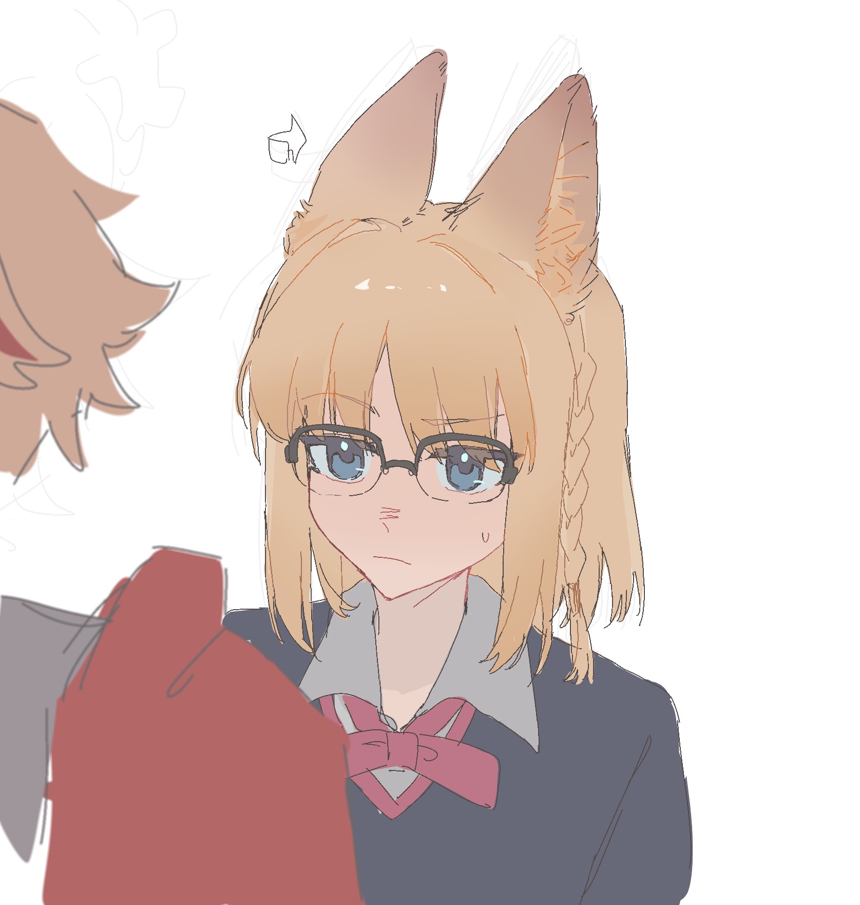 1boy 1girl animal_ears blonde_hair blue_eyes braid chinese_commentary collared_shirt commentary_request fate/strange_fake fate_(series) fox_ears fox_girl glasses highres kemonomimi_mode medium_hair qumingshigehenmafandedongdong raised_eyebrow richard_i_(fate) sajou_ayaka_(fate/strange_fake) shirt side_braid simple_background sweatdrop sweater upper_body white_background