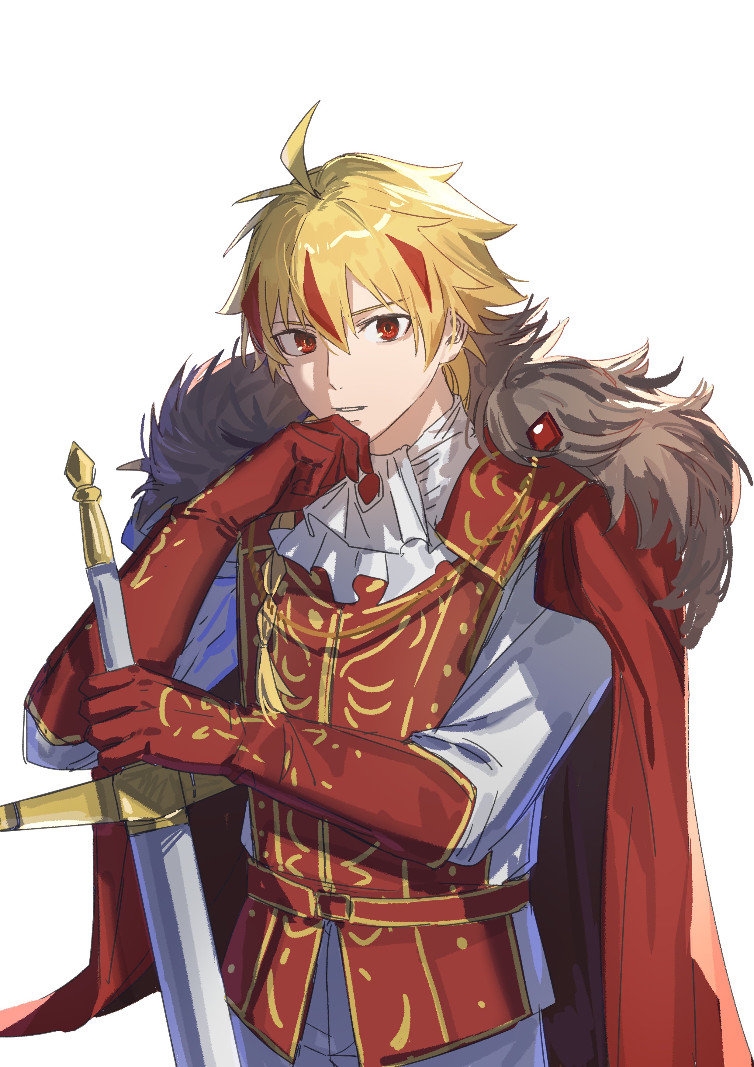 1boy absurdres ahoge ascot blonde_hair braid braided_ponytail cape fate/strange_fake fate_(series) fur-trimmed_cape fur_trim gloves highres holding holding_sword holding_weapon long_hair long_sleeves looking_at_viewer male_focus multicolored_hair open_mouth red_eyes red_streaks richard_i_(fate) shirt simple_background single_braid solo streaked_hair sword tj0yzi0vrkl7gny upper_body vest weapon white_background