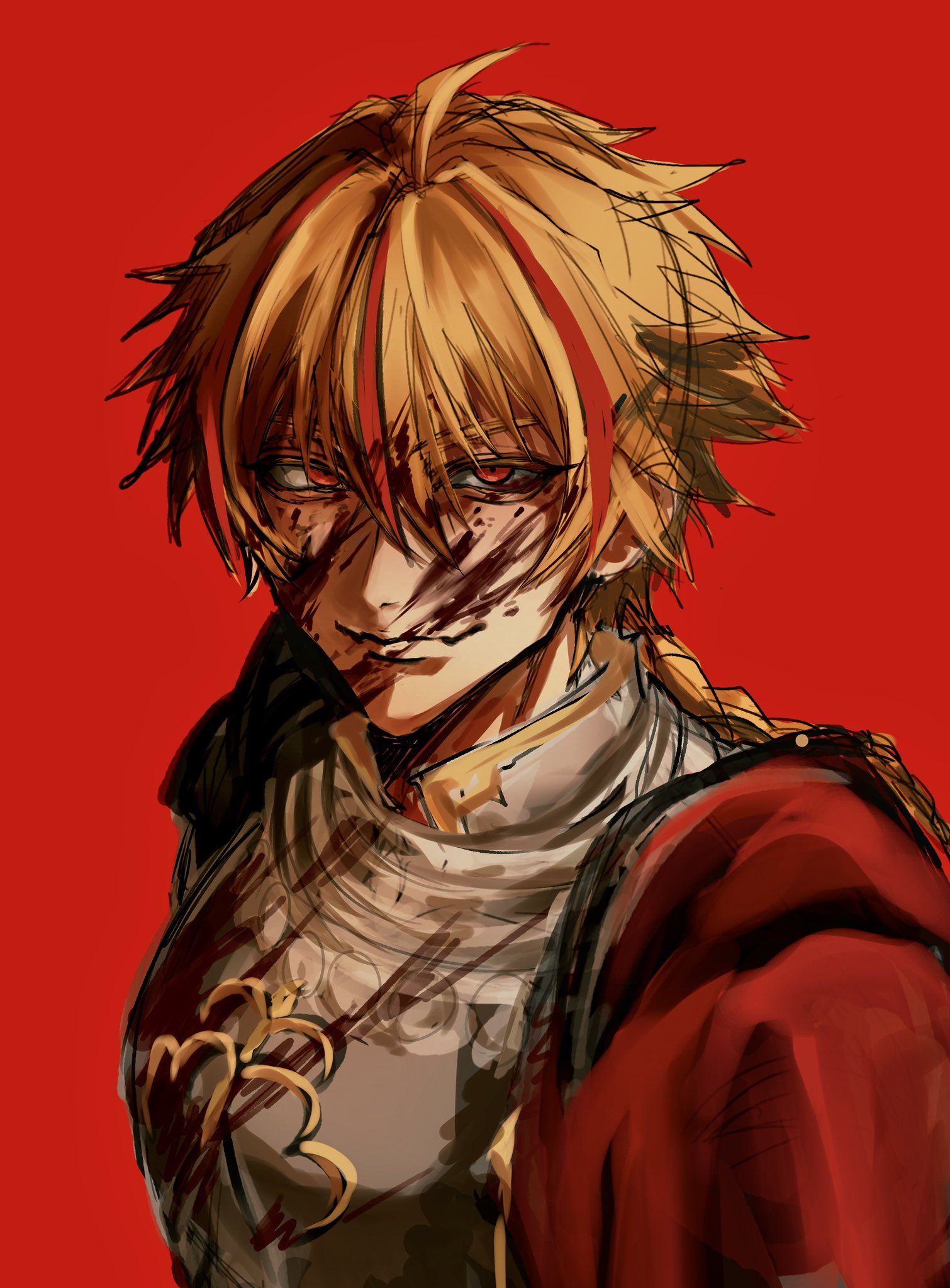1boy ahoge armor blonde_hair blood blood_on_face braid braided_ponytail cape commentary_request fate/strange_fake fate_(series) highres long_hair looking_at_viewer male_focus multicolored_hair red_background red_streaks richard_i_(fate) simple_background single_braid smile solo streaked_hair upper_body zz_kyou_zz