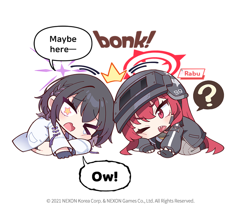 >_< 2girls ? black_hair blue_archive braid character_name chibi coat commentary donmin_h english_commentary english_text fingerless_gloves gloves halo helmet long_hair long_sleeves medium_hair motion_lines multiple_girls no_nose official_art one_eye_closed open_mouth purple_halo rabu_(blue_archive) red_eyes red_hair red_halo sharp_teeth single_braid speech_bubble spoken_question_mark subaru_(blue_archive) tearing_up teeth very_long_hair white_coat