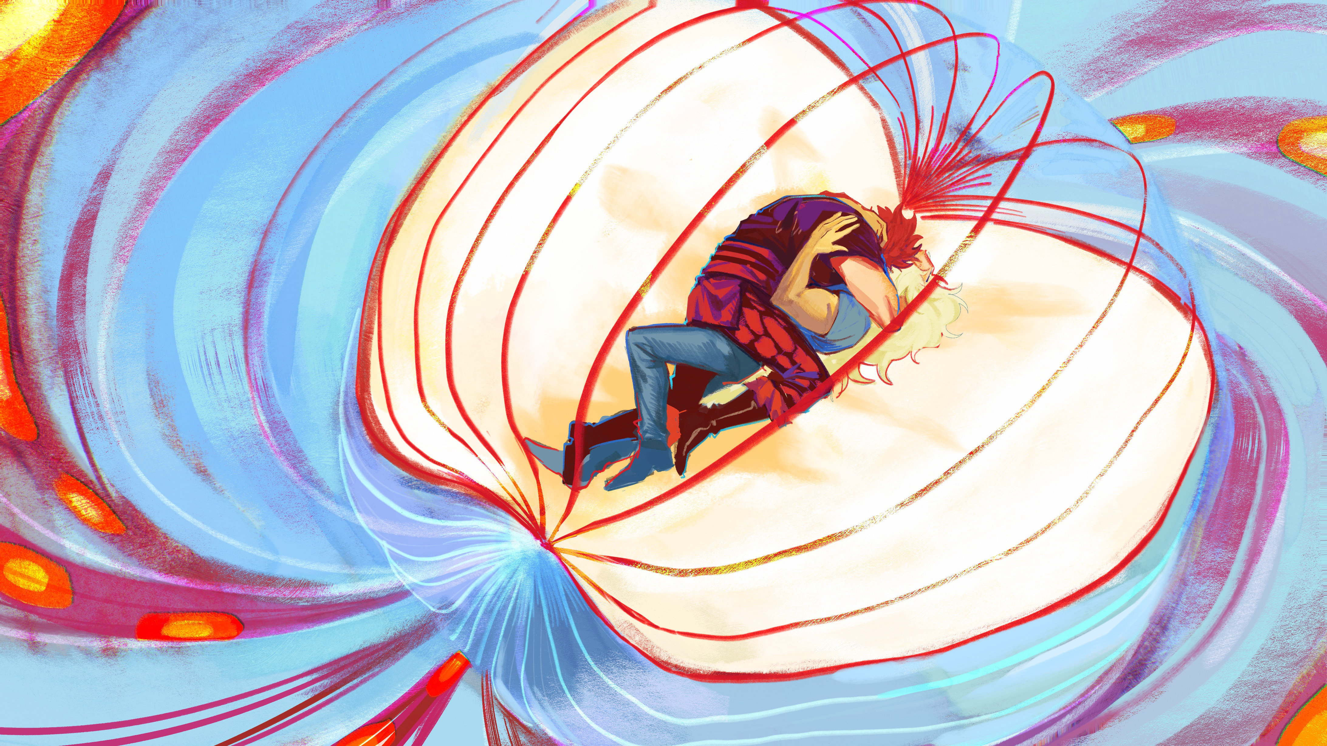 2boys abstract absurdres black_boots black_shirt blonde_hair blue_pants blue_shirt boots commentary_request denisefanta eustass_kid highres hug killer_(one_piece) long_hair male_focus multiple_boys one_piece pants red_hair ribbon shirt short_hair symbolism yaoi