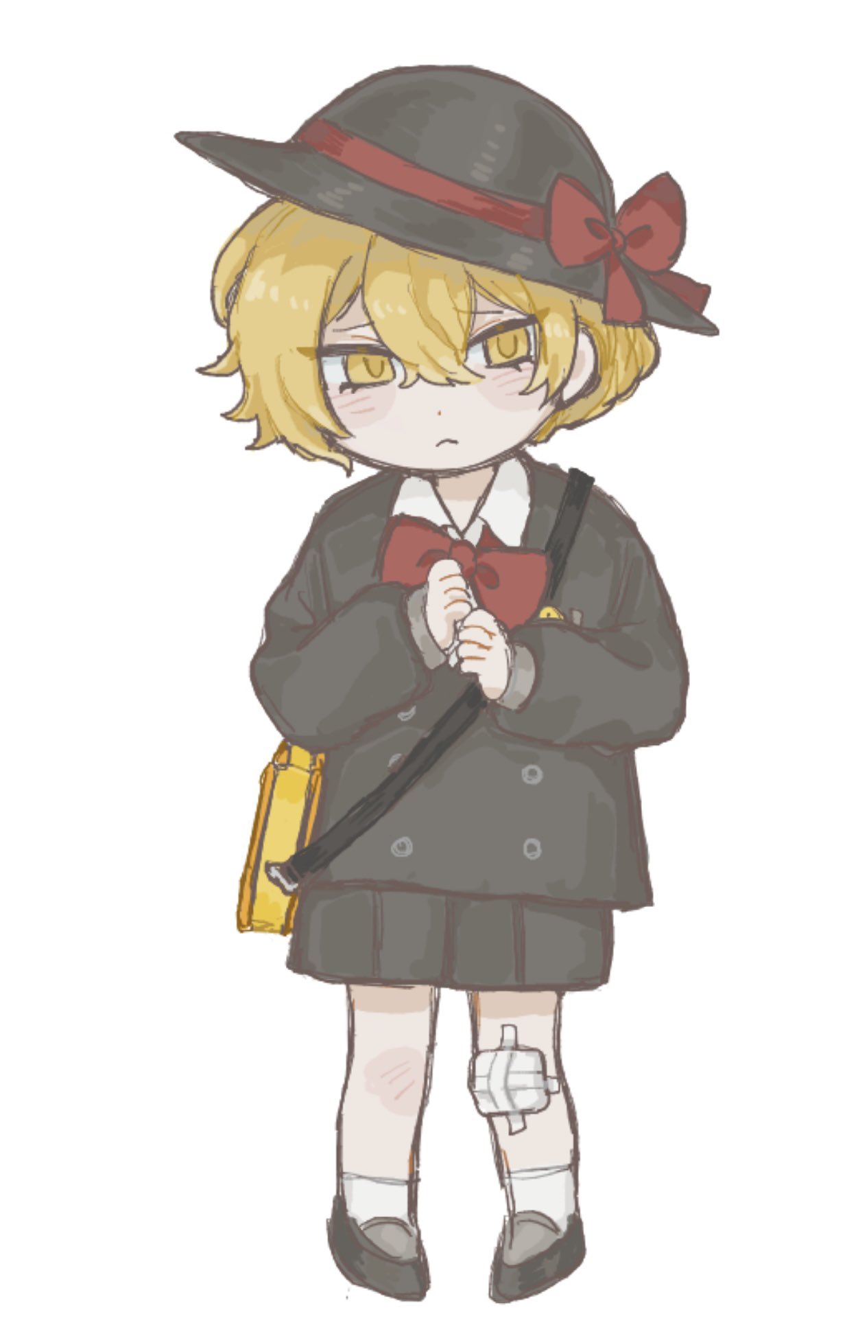 1boy aged_down animal_bag black_hat black_jacket black_shoes blonde_hair blush bow bowtie closed_mouth commentary gauze_on_knee hat hat_bow highres jacket limbus_company limbus_kindergarten_uniform project_moon red_bow red_bowtie ryooo_catflower shoes simple_background sinclair_(project_moon) socks solo white_background white_socks yellow_eyes