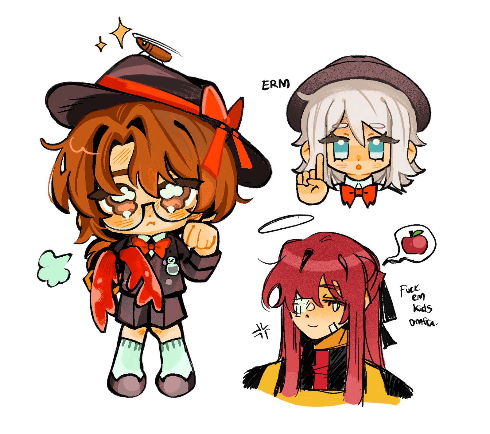 1boy 2girls ackchyually_(meme) apple black_hat black_jacket black_shoes black_shorts blue_eyes bug closed_eyes closed_mouth cockroach commentary english_commentary faust_(project_moon) food fruit gregor's_cockroach_(project_moon) gregor_(project_moon) halo hat highres index_finger_raised insect jacket limbus_company limbus_kindergarten_uniform long_hair meme multiple_girls pink_hair project_moon qiqi_(amsvartnir) shoes short_hair shorts sidelocks smile sparkle speech_bubble very_long_hair white_hair yuri_(project_moon)