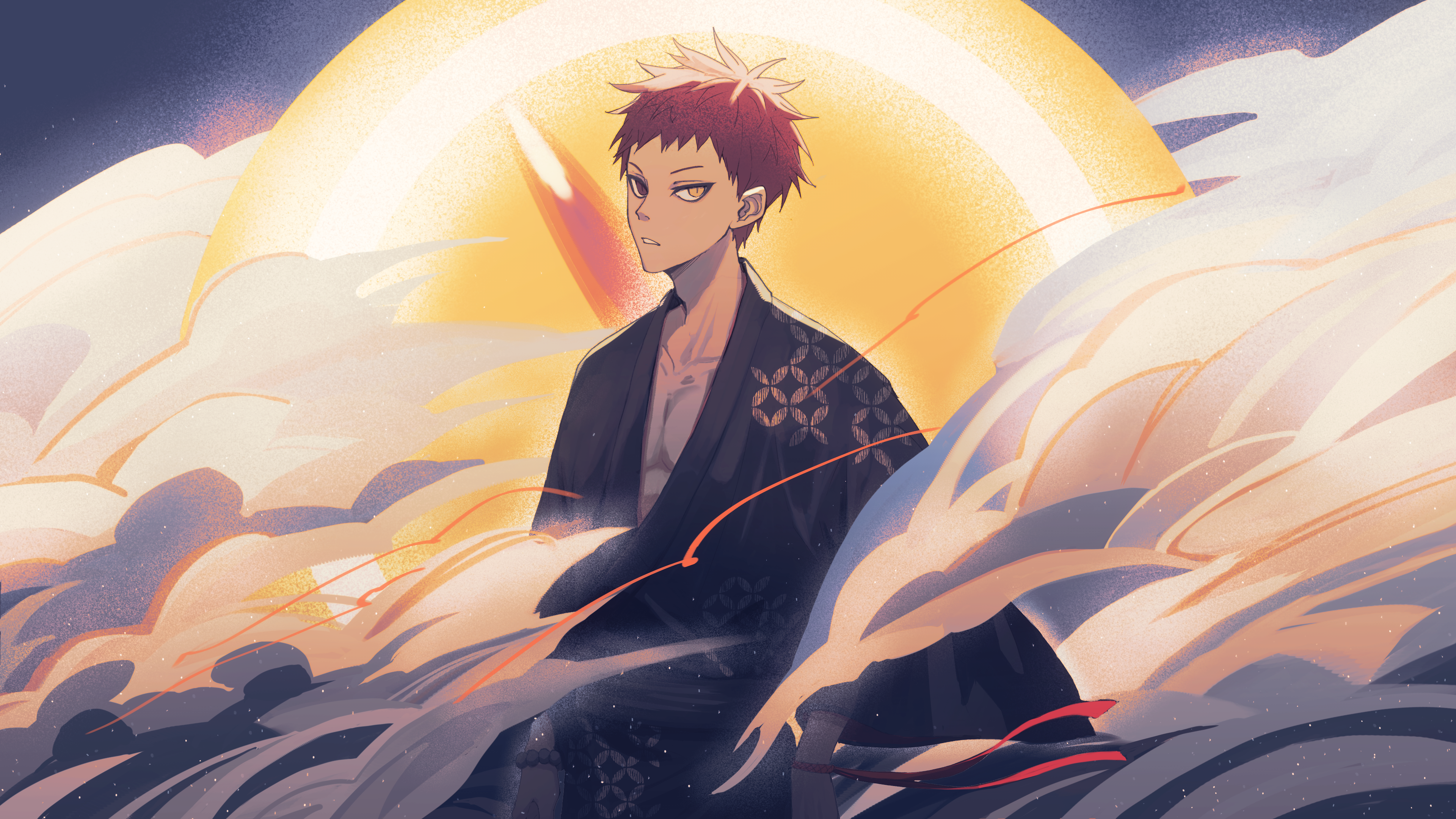 1boy absurdres akashi_seijuurou arms_at_sides bead_bracelet beads bracelet collarbone commentary_request gensyuuu heterochromia highres japanese_clothes jewelry kuroko_no_basuke looking_at_viewer male_focus pectoral_cleavage pectorals red_hair ribbon short_hair smoke solo standing wide_sleeves wrist_ribbon