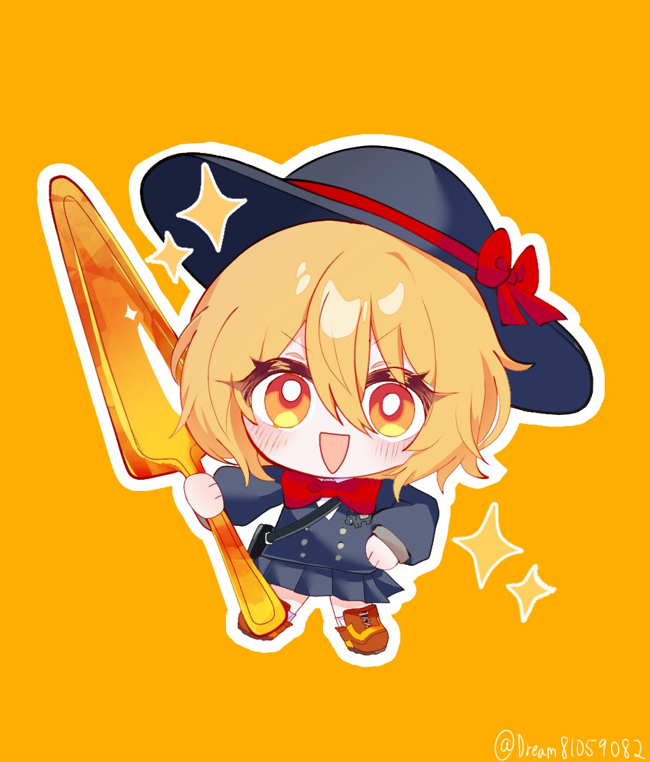 1girl :d aged_down bag balloon black_bag black_hat black_skirt blonde_hair bow bowtie brown_shoes buttons child contrast_collar don_quixote_(project_moon) dream81059082 full_body grey_jacket hair_between_eyes hat hat_bow holding holding_polearm holding_weapon jacket kindergarten_uniform korean_text lance legs_up limbus_company limbus_kindergarten_uniform long_sleeves looking_at_viewer official_alternate_costume open_mouth orange_eyes polearm project_moon red_bow red_bowtie shoes short_hair shoulder_bag sidelocks simple_background skirt smile solo teeth upper_teeth_only v weapon white_background