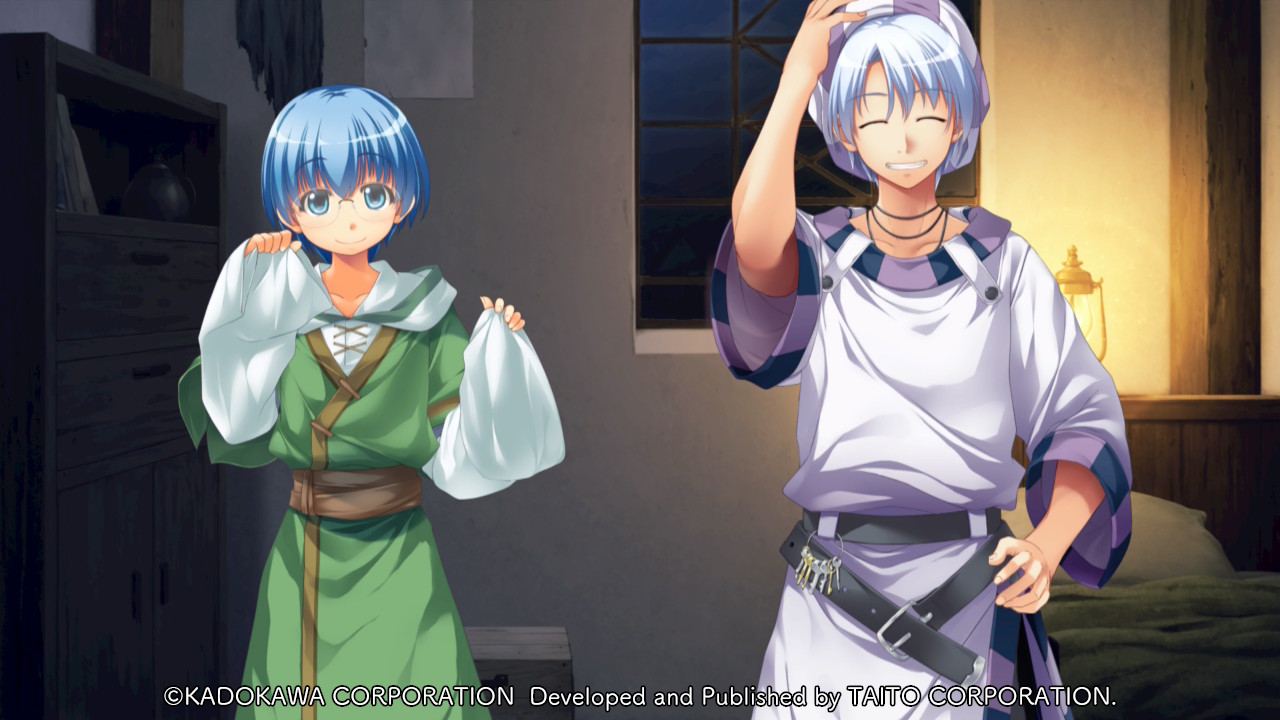2boys ^_^ aleph_coulson_(revival) atelier-moo belt black_belt blue_eyes blue_hair christpher_cross_(revival) clenched_teeth closed_eyes closed_mouth collarbone cowboy_shot game_cg glasses hair_between_eyes hand_on_own_head hooded_robe indoors layered_sleeves long_sleeves multiple_boys night non-web_source official_art oversized_clothes purple_shirt robe shirt short_hair short_over_long_sleeves short_sleeves sleeves_past_wrists smile standing striped_hat teeth three-quarter_sleeves white_hair yuukyuu_gensoukyoku yuukyuu_gensoukyoku_revival
