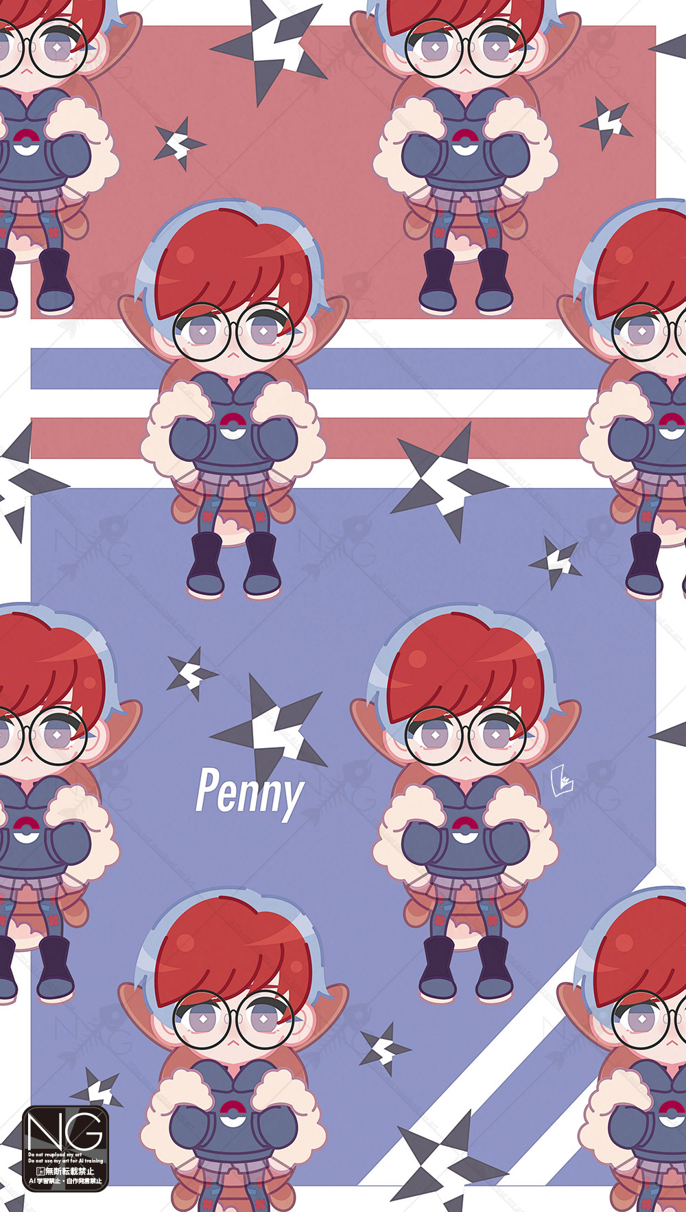 1girl bag black_boots black_hoodie blue_hair boots brown_bag character_backpack character_name chibi closed_mouth commentary_request eevee_backpack glasses grey_eyes hands_in_pockets highres hood hoodie long_sleeves looking_at_viewer meme_(sleepsheep) multicolored_hair nintendo pantyhose penny_(pokemon) pokemon pokemon_scarlet_and_violet print_pantyhose red_hair round_eyewear see-through_clothes see-through_skirt short_hair shorts skirt star_(symbol) two-tone_hair