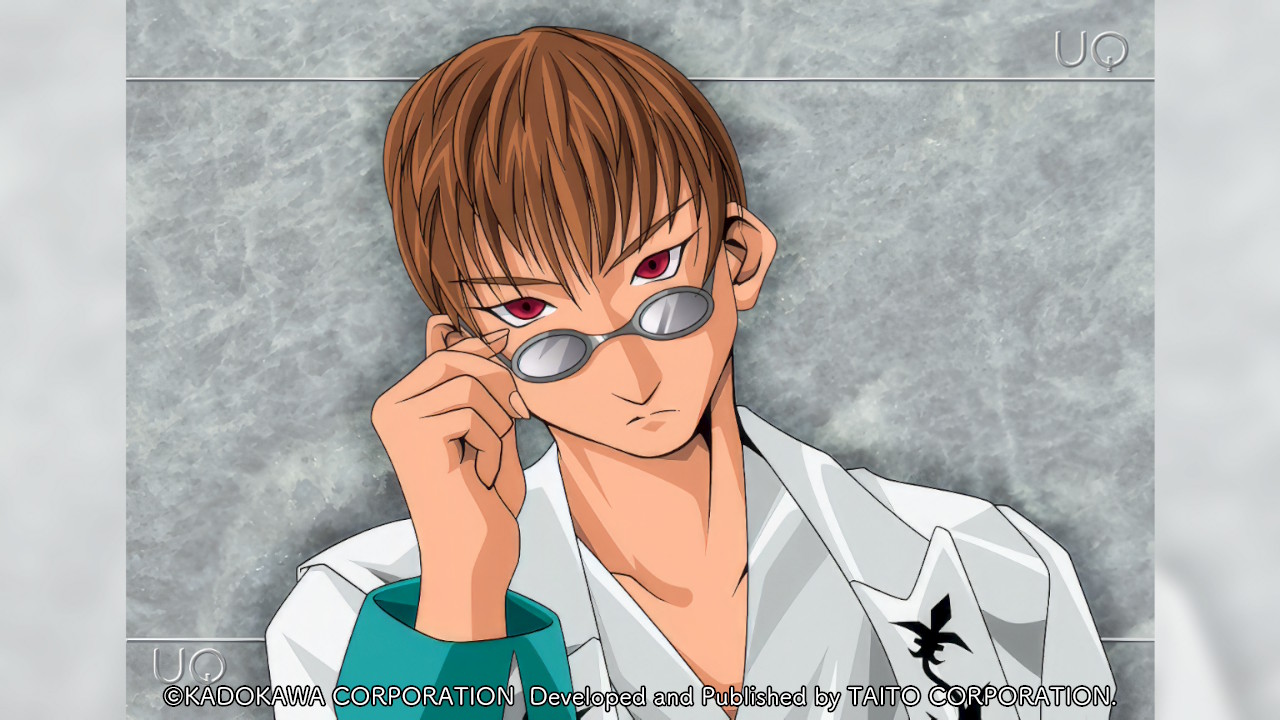 1boy 2000s_(style) adjusting_eyewear anime_coloring atelier-moo brown_hair closed_mouth coat game_cg head_tilt male_focus non-web_source official_art red_eyes shirt short_hair simple_background solo standing sunglasses toya_cloud tsurime upper_body v-shaped_eyebrows white_coat white_shirt yuukyuu_gensoukyoku