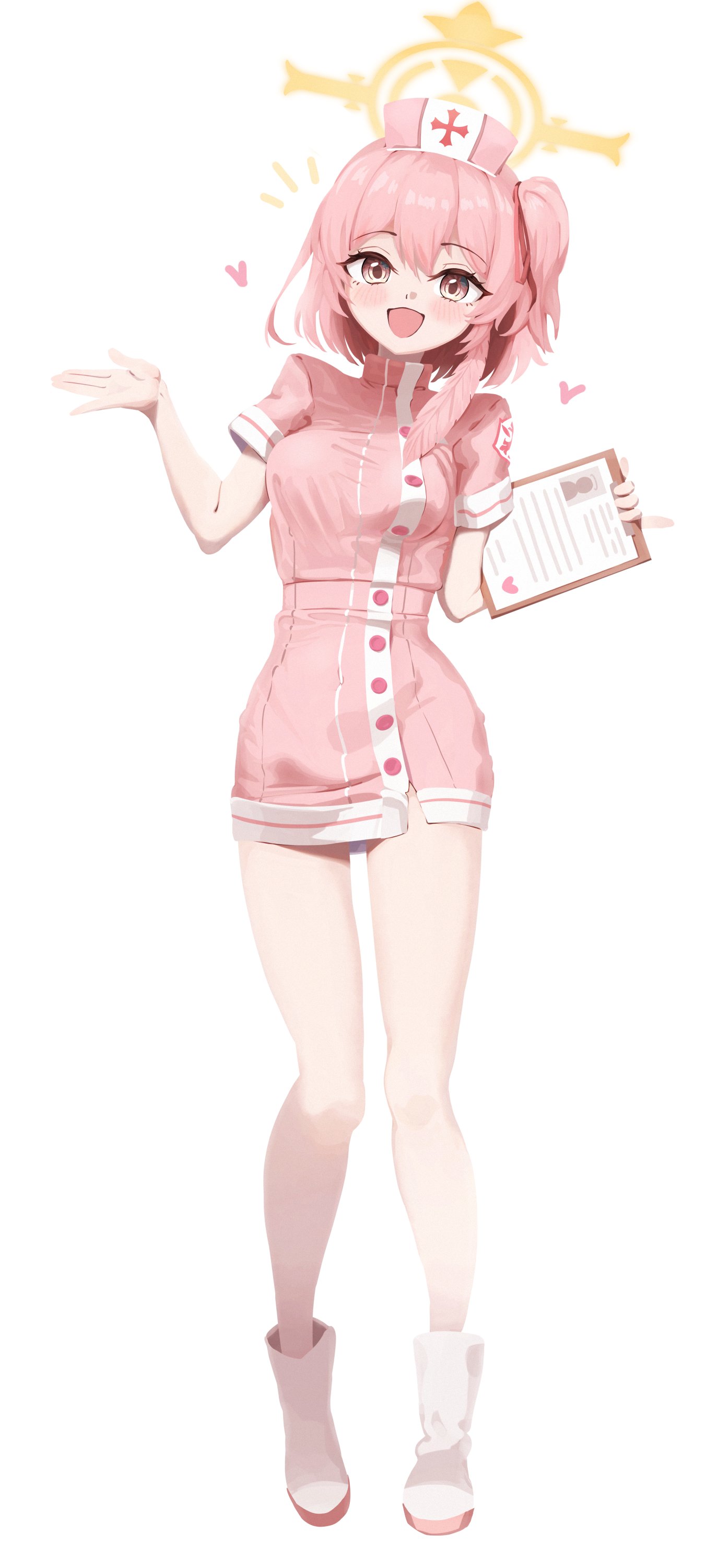 1girl absurdres blue_archive breasts clipboard commentary_request dress full_body hair_ribbon halo hat heart highres holding holding_clipboard long_hair looking_at_viewer medium_breasts nurse nurse_cap official_alternate_costume one_side_up open_mouth pink_dress pink_hair pink_hat ribbon serina_(blue_archive) serina_(nurse)_(blue_archive) shoes short_sleeves simple_background solo white_background white_shoes yellow_eyes yellow_halo yunsong97