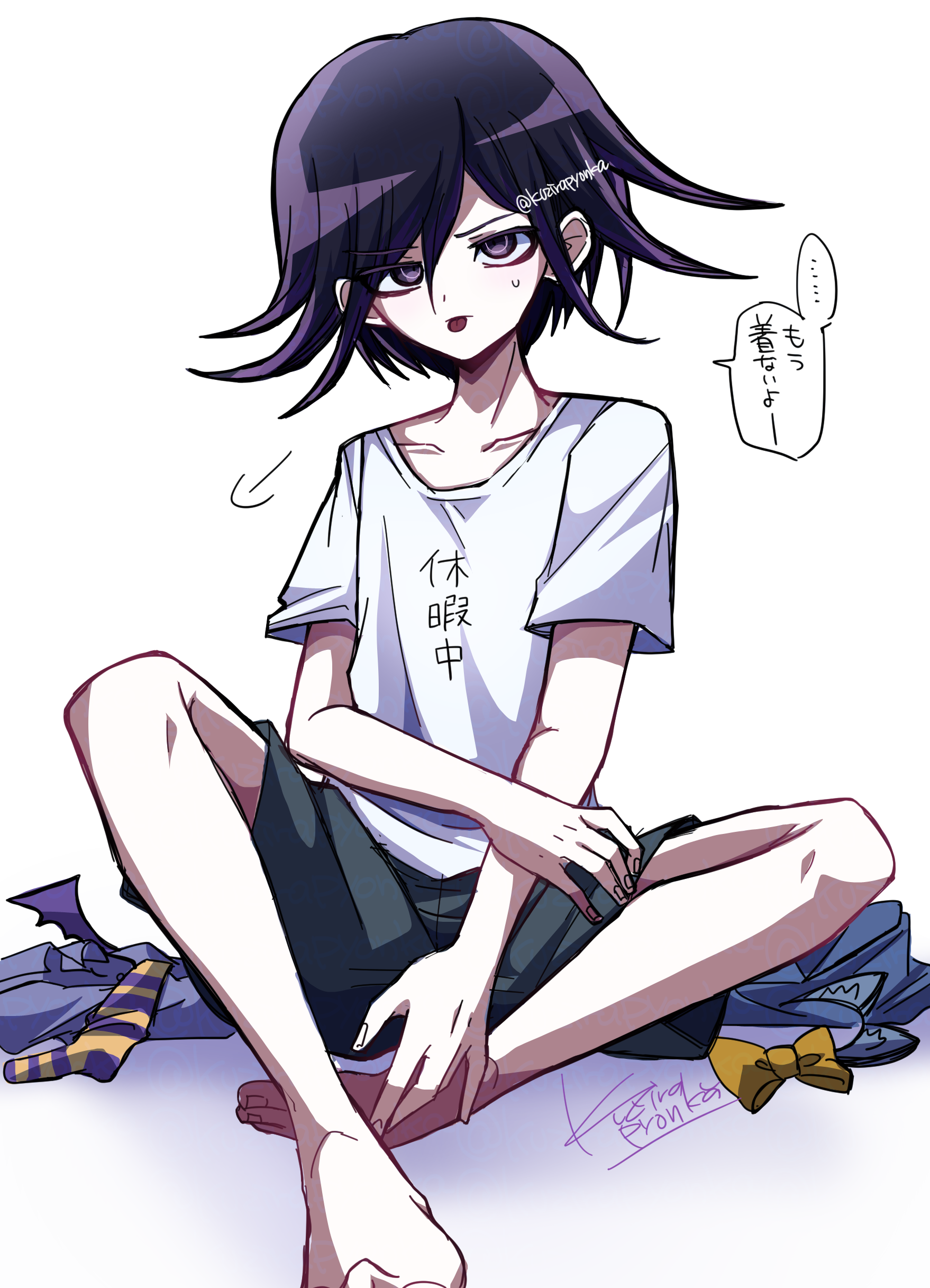 1boy :p absurdres barefoot black_hair black_shorts bow collarbone commentary_request danganronpa_(series) danganronpa_v3:_killing_harmony flipped_hair highres kujira_pyon_ka male_focus multicolored_hair oma_kokichi pink_hair shirt short_sleeves shorts sitting solo sweatdrop tongue tongue_out translation_request two-tone_hair white_shirt