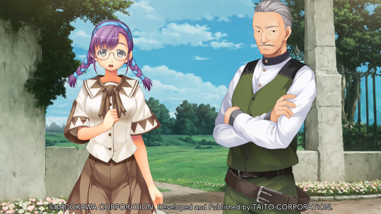 1boy 1girl asymmetrical_bangs atelier-moo braid breasts brown_ribbon brown_skirt cheryl_christia_(revival) cowboy_shot crossed_arms facial_hair game_cg glasses green_vest grey_eyes grey_hair hair_slicked_back hairband long_hair low_twin_braids mature_male medium_breasts mustache non-web_source official_art outdoors pants purple_hair ribbon ricardo_foster school_uniform shirt short_sleeves skirt standing twin_braids vest yuukyuu_gensoukyoku yuukyuu_gensoukyoku_revival