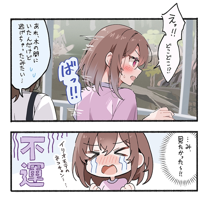 >_< 2girls blush breasts brown_hair closed_eyes commentary_request crying hair_between_eyes hawawa-chan's_sister_(sirokuma_shake) hawawa-chan_(sirokuma_shake) motion_lines multiple_girls open_mouth original outdoors pink_shirt purple_eyes red_eyes shirt short_sleeves sirokuma_shake skirt solo_focus speech_bubble streaming_tears tears translation_request white_shirt zoo