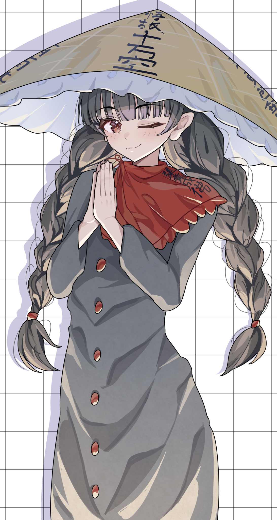 1girl ajirogasa black_hair braid braided_twintails brown_hat buttons capelet closed_mouth commentary_request cowboy_shot dress drop_shadow grey_dress grid_background hands_up hat highres light_blush long_sleeves looking_at_viewer one_eye_closed own_hands_together red_capelet red_eyes red_ribbon ribbon smile solo standing suzukiairi0001 touhou yatadera_narumi