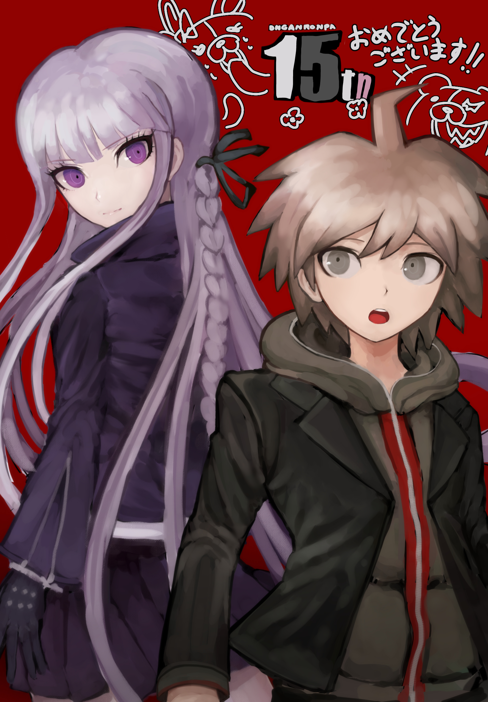 1boy 1girl ahoge anniversary black_gloves black_jacket black_ribbon bow braid brown_hair closed_mouth commentary_request danganronpa:_trigger_happy_havoc danganronpa_(series) ear_bow gloves green_hoodie grey_hair hair_ribbon highres hood hood_down hoodie jacket kirigiri_kyoko long_hair looking_at_viewer miniskirt monokuma monomi_(danganronpa) naegi_makoto nikuiro_no_i open_clothes open_jacket pink_hair pleated_skirt purple_eyes red_background ribbon side_braid skirt smile